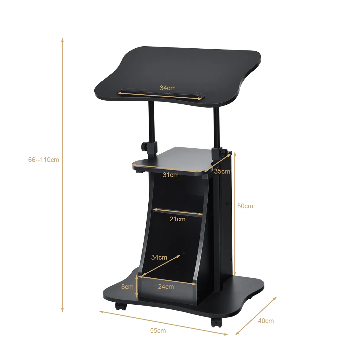De hoogte van de tafel is verstelbaar van 66 cm tot 110 cm voor zittend of staand werken. En de desktop kan vrij worden gekanteld voor de meest comfortabele werkhoek. U kunt de knoppen aanpassen om een ergonomische houding in te stellen en uw ruggengraat en gezichtsvermogen te beschermen. 2 open vakken bieden ruime opbergruimte om je werkspullen in op te bergen. 4 soepele wielen zorgen ervoor dat de laptopwagen overal kan bewegen. Het is perfect voor een sta-bureau om aan je laptop te werken of een presentatie te geven tijdens een conferentie.
