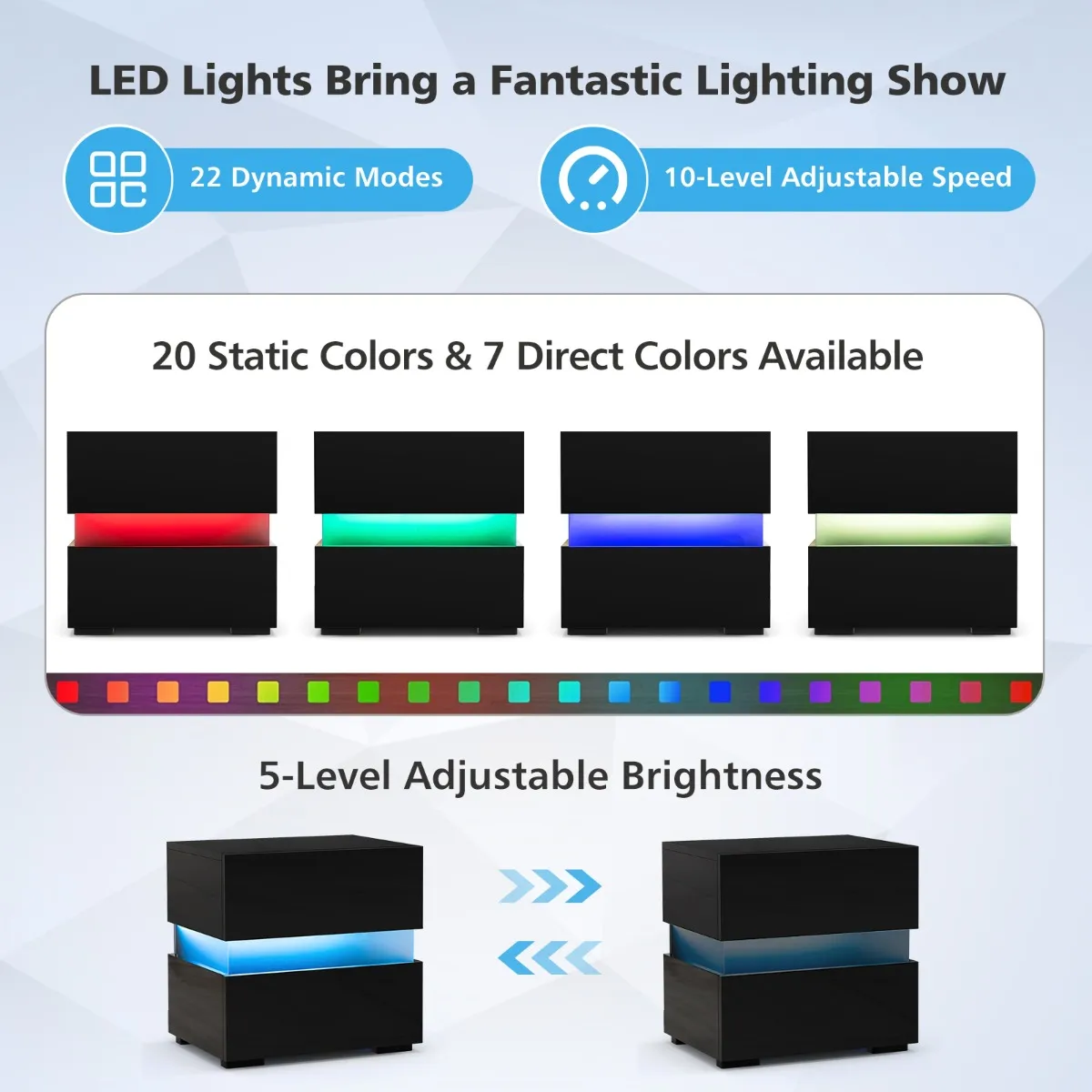 Het nachtkastje is de perfecte combinatie van opbergruimte en modern design. Het heeft een breed blad en 2 lades, die beide plaats bieden aan een groot aantal spullen. Dankzij de kabelopening kun je verschillende draden ordenen. De LED-verlichting zorgt voor een fantastische lichtshow. Er zijn 22 dynamische standen, 20 statische kleuren en 7 directe kleuren. Je kunt volledig gebruik maken van de draadloze RF-afstandsbediening om de snelheid op 10 niveaus en de helderheid op 5 niveaus te regelen. De maximale afstand is 15 m. Hij kan worden gebruikt in de woonkamer, slaapkamer, kantoor en nog veel meer.