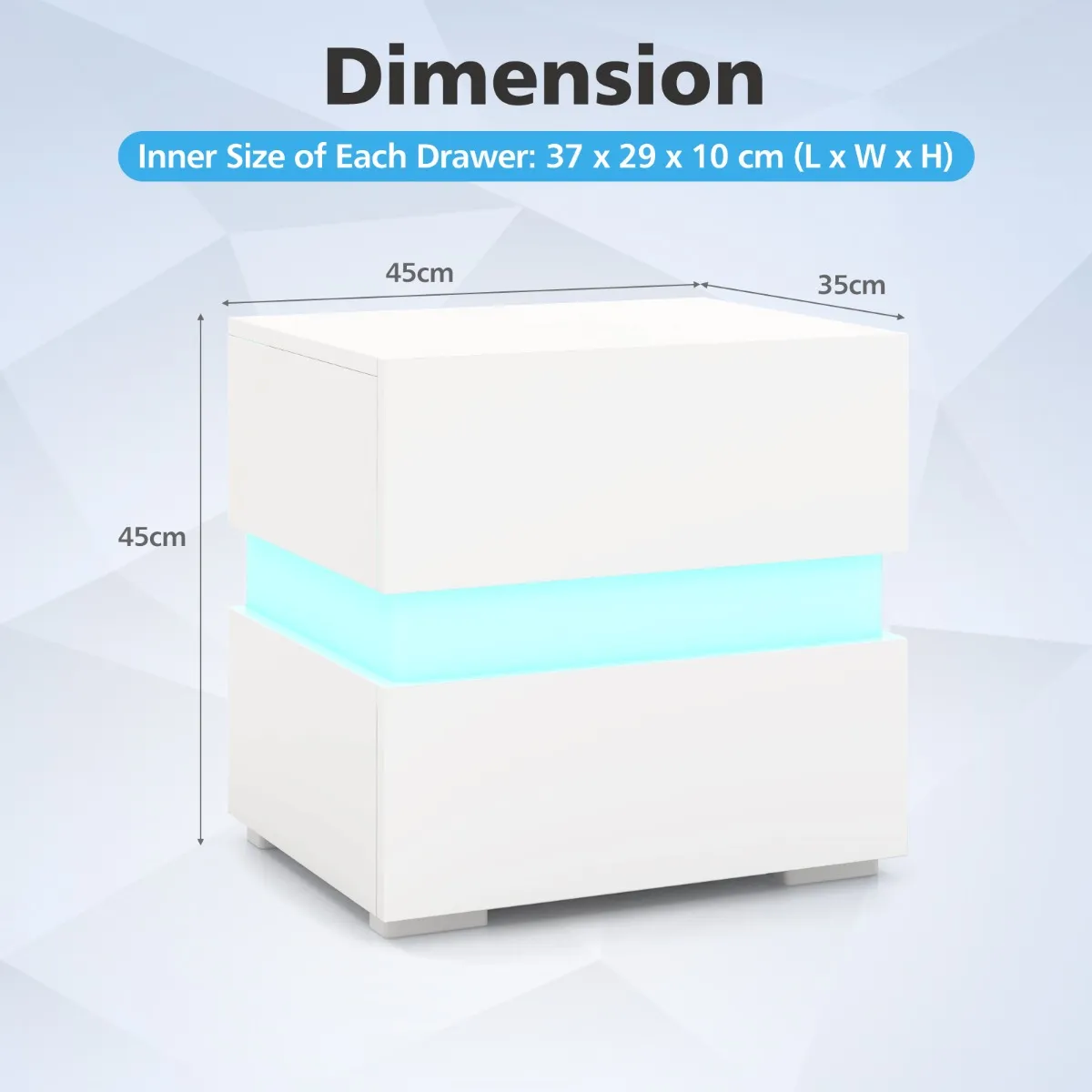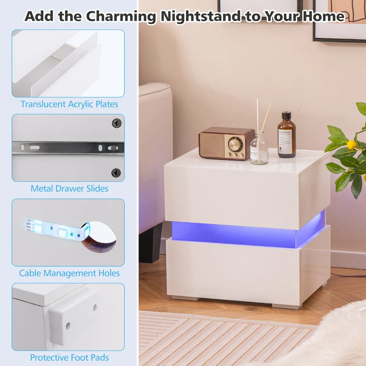 Het heeft een breed tafelblad en 2 lades waarin veel spullen kunnen worden opgeborgen. Dankzij de kabelmanagementopening kunnen diverse kabels worden opgeborgen zonder dat ze in de knoop raken. Bovendien zorgen de LED-lampen voor een fantastisch lichtspektakel. Er zijn meer dan 22 dynamische modi, 20 statische kleuren en 7 directe kleuren. U kunt de draadloze RF-afstandsbediening volledig gebruiken om de snelheid op 10 niveaus en de helderheid op 5 niveaus te regelen. Het maximale bereik is 15 meter. Afhankelijk van uw wensen kan het nachtkastje gebruikt worden in de woonkamer, slaapkamer, studeerkamer en meer.