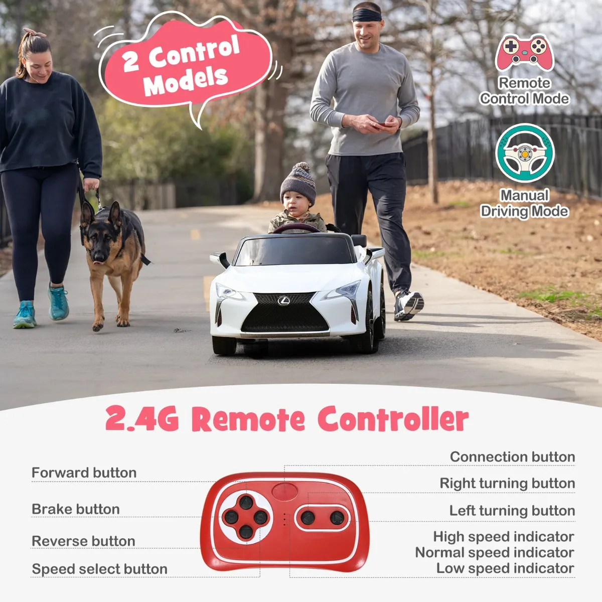Deze Lexus LC500 gelicentieerde auto geeft je kinderen fantastisch rijplezier. Ouders kunnen de snelheid en het stuur bedienen via de 2,4G afstandsbediening voor extra veiligheid. Je kinderen kunnen hem handmatig bedienen met de versnellingspook en door op het pedaal te drukken. Verschillende ingebouwde muziekjes en verhaaltjes maken het rijden interessant. Hij is ontworpen met vering voor een soepele rit en slow-start technologie voor de veiligheid, en 4 anti-slip wielen voor bijna alle terreinen.