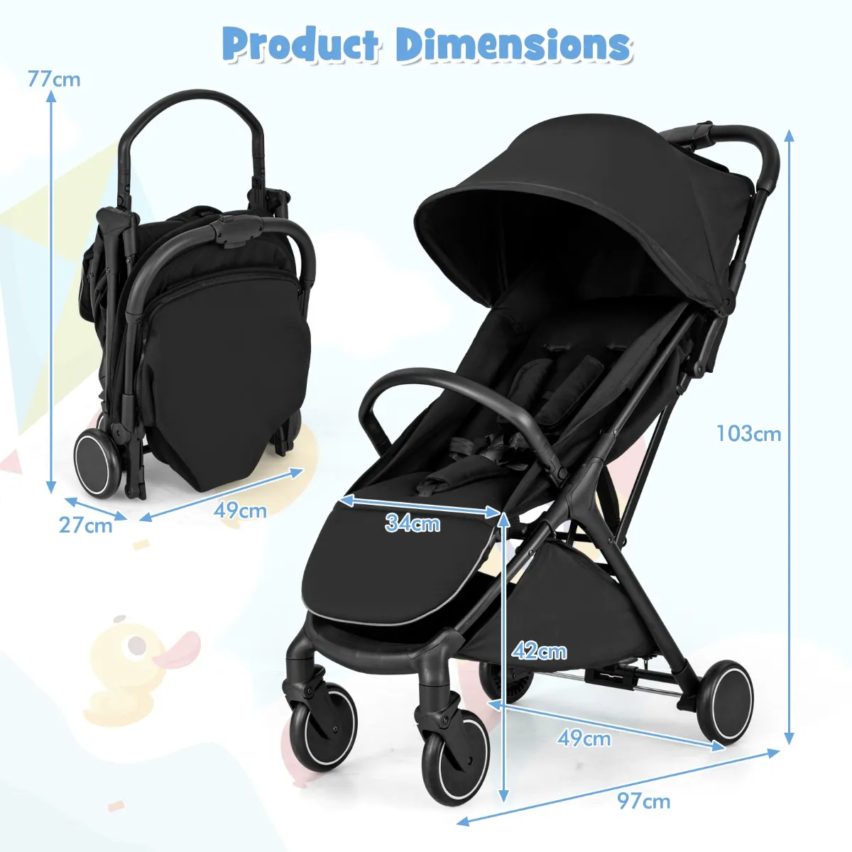 Onze lichtgewicht kinderwagen is voorzien van een innovatief mechanisme waarmee u de kinderwagen met één hand kunt in- en uitvouwen. Hierdoor kunt u de kinderwagen zelfstandig neerzetten, wat hem gemakkelijk opbergt en meeneemt. Dankzij het lichtgewicht aluminium frame en de schokabsorberende wielen is hij gemakkelijk te manoeuvreren. De stoel beschikt over een verstelbare rugleuning van 115° tot 170°, een voetensteun die in 3 standen verstelbaar is en een 5-puntsgordel met een remsysteem dat met één stap kan worden bediend. Dankzij de uitschuifbare kap met venster blijft uw baby in de schaduw, maar kunt u hem of haar toch in de gaten houden.