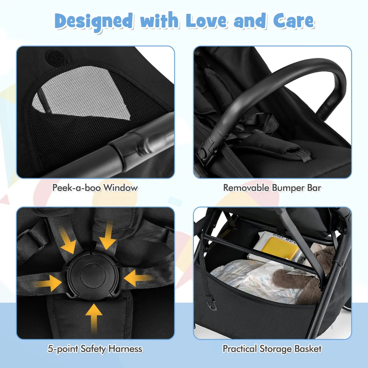 【In- en uitvouwen met één hand】: Deze kinderwagen heeft een innovatief zwaartekracht in- en uitvouwsysteem met één hand, zodat ouders hem kunnen gebruiken terwijl ze hun kleintje vasthouden. Bovendien staat hij rechtop wanneer hij opgevouwen is, zodat je hem niet tegen een muur hoeft te leunen.