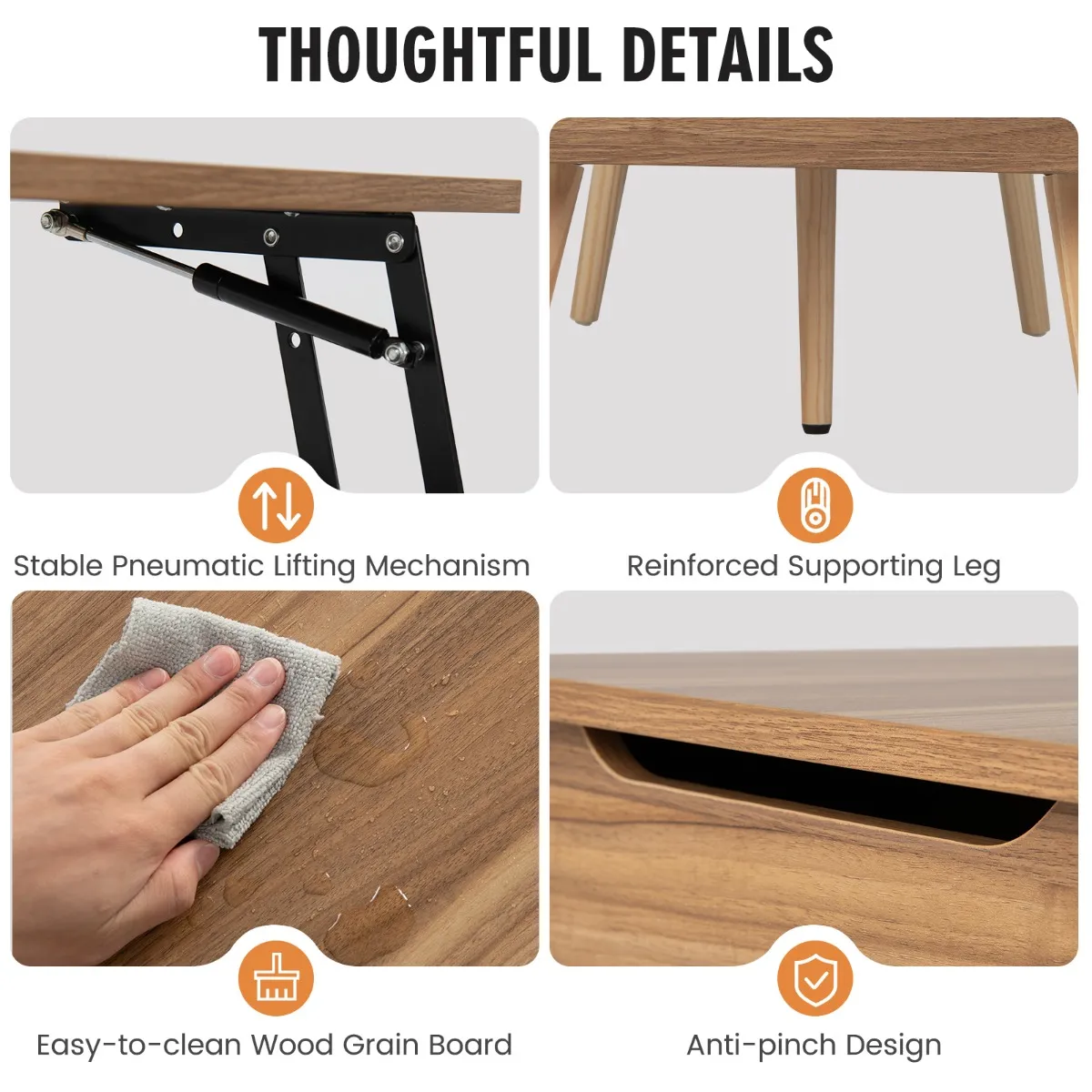 Veel opbergruimte: Als het tafelblad wordt opgetild, hebt u toegang tot de verborgen opbergvakken, die ruim zijn voor opslag. U kunt dus spullen opbergen die vroeger op het tafelblad lagen, zoals de afstandsbediening, tissuedoos, tijdschriften en snacks, waardoor het tafelblad opgeruimd en georganiseerd is.