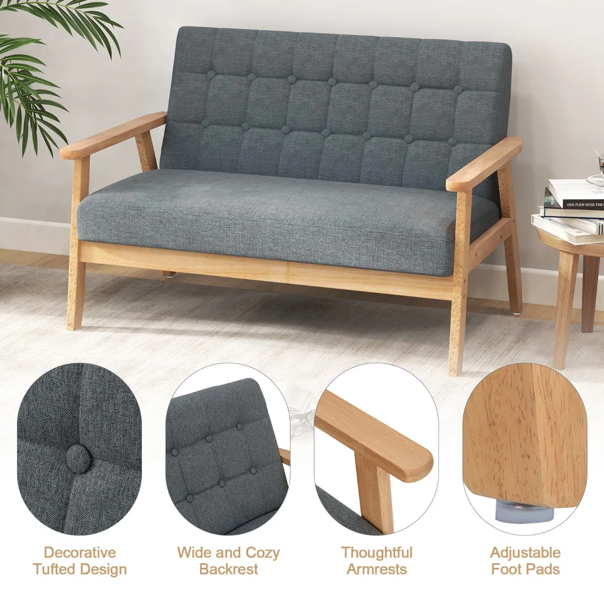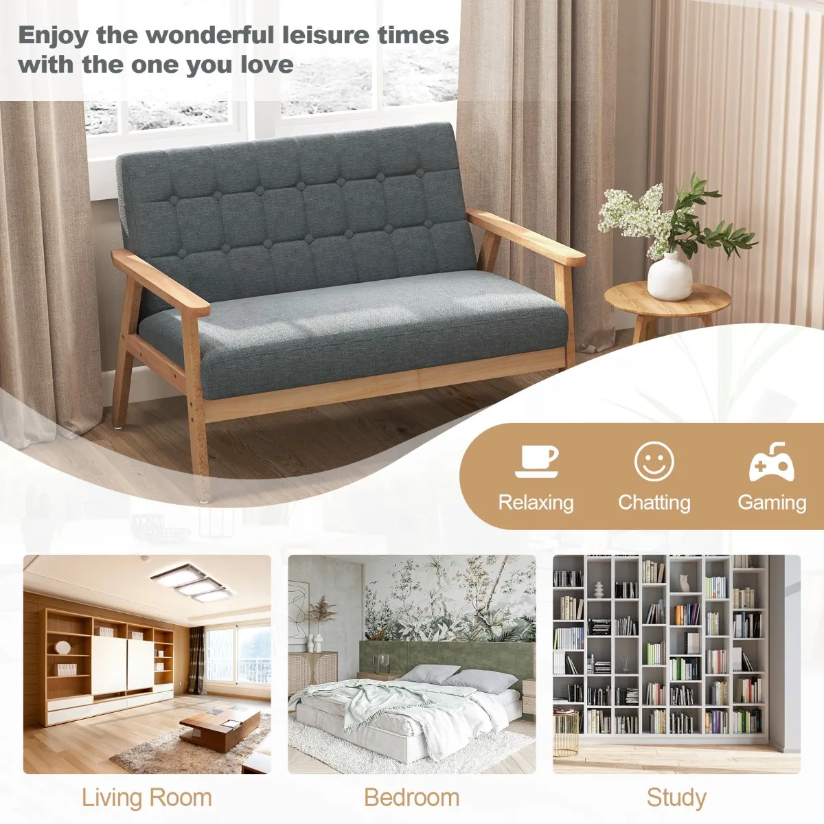 Veelzijdig gebruik: Met zijn mid-century stijl past deze 2-zits loveseat goed bij andere meubels. Met deze elegante loveseat kun je tv kijken in de woonkamer, ontspannen in de slaapkamer of lezen in de studeerkamer.