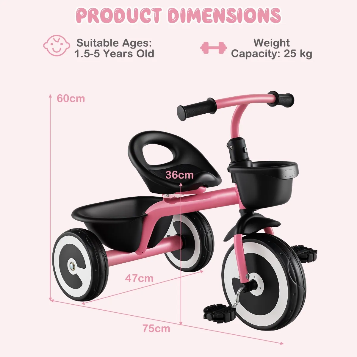 Dankzij een verstelbare zitting voor individueel comfort is deze driewieler geschikt voor kinderen van 1,5 tot 5 jaar. De stabiliteit van de driewieler en de 110°-stuurhoek zorgen voor stabiliteit. Dankzij de hoogwaardige EVA-wielen is de driewieler voor kleine kinderen zowel geschikt voor indoor- als outdoor-avonturen. De manden voor en achter bieden royale opbergruimte voor kinderspeelgoed en snacks. Het is het perfecte cadeau voor kleine ontdekkingsreizigers die plezier hebben bij het rijden en hun motorische vaardigheden willen verbeteren.
