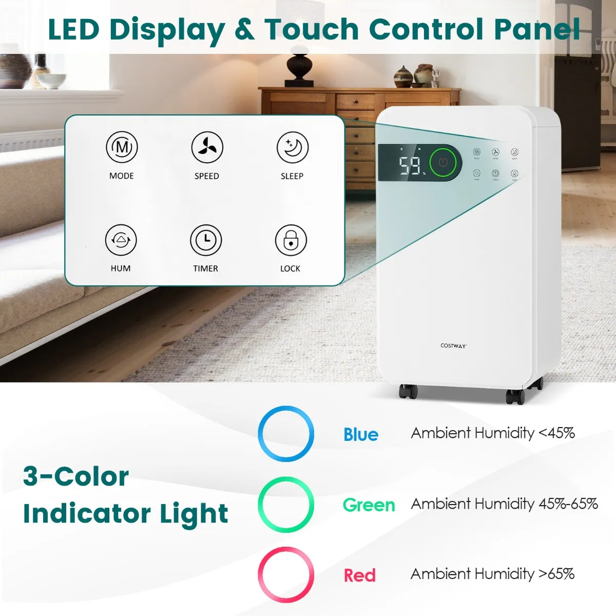 3 modi, 2 snelheden en 3-kleurige weergave: Deze luchtontvochtiger is verkrijgbaar in 3 modi (automatisch, continu drogen, slaapmodus) en 2 ventilatorsnelheden (hoog, laag) om je individueel comfort te bieden. De bediening is eenvoudig met het led-display en het touch-bedieningspaneel. De 3-kleurige weergave geeft verschillende kleuren afhankelijk van de omgevingsvochtigheid: blauw, 65%.