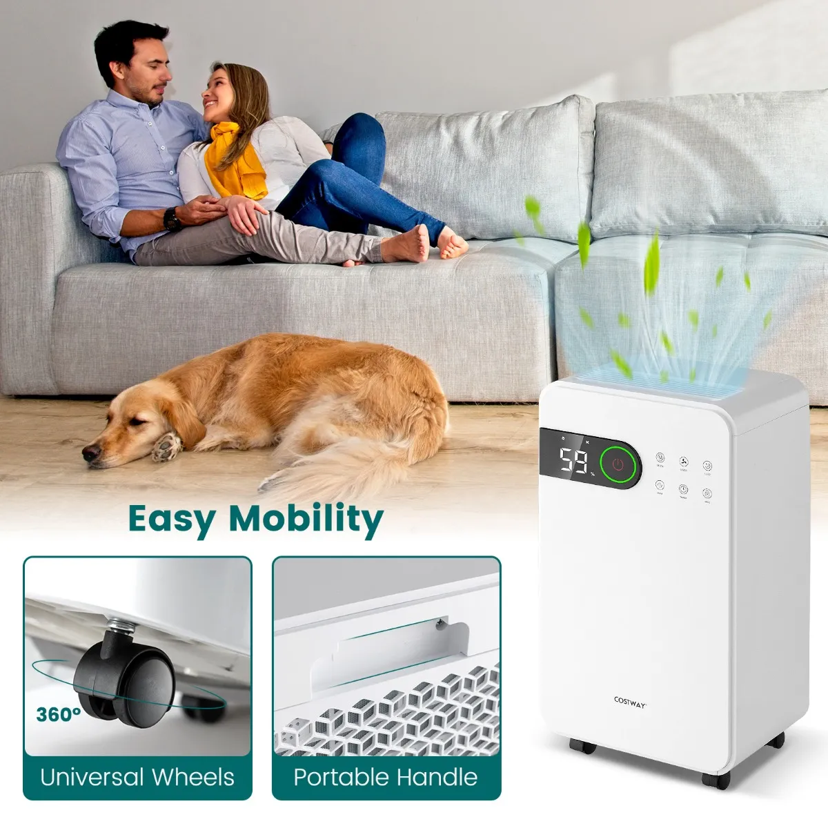 Met een ontvochtigingscapaciteit van 15 liter per dag (@ 35 °C, 90% luchtvochtigheid) helpt deze luchtontvochtiger je verschillende problemen op te lossen die door hoge luchtvochtigheid worden veroorzaakt, zoals natte kleding, condensatie, beschadigde meubels, muffe geuren, vochtige muren, ademhalingsproblemen en meer. Hij biedt je 3 modi (automatisch, continu drogen, slaapmodus) en 2 snelheden (hoog, laag) en een instelbare luchtvochtigheid van 30% tot 80%. Dankzij de stille werking kun je genieten van een rustige slaapomgeving.
