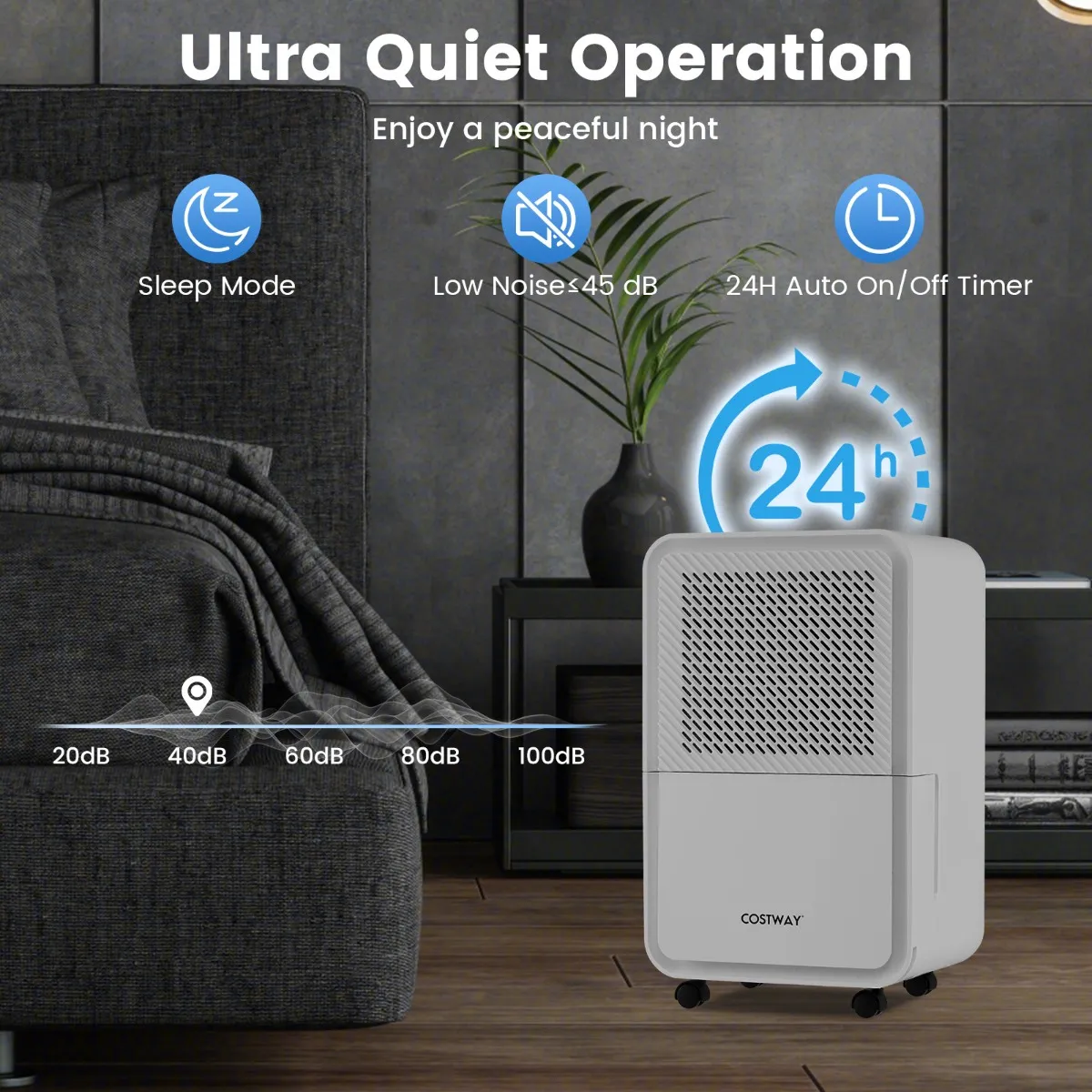 Ultrastille werking: Geniet van een rustige nachtrust dankzij de stille werking (≤45 dB) van deze luchtontvochtiger. De luchtontvochtiger is voorzien van een slaapmodus voor een nog stillere werking. Bovendien kunt u met de 24-uurs timer de automatische in- en uitschakeltijd instellen voordat u naar bed gaat of het huis verlaat.