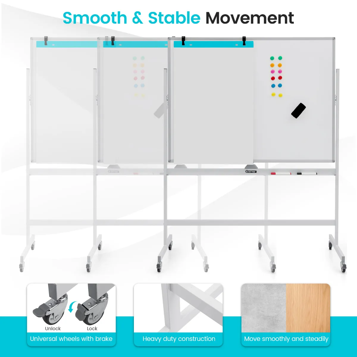 Dit dubbelzijdige whiteboard met verstelbare hoogte kan worden aangepast tot 160 cm of 180 cm en voldoet aan de behoeften van volwassenen en kinderen. Daarnaast worden presentaties, interactieve lessen of ouder-kind activiteiten efficiënter met dit mobiele staande whiteboard. Dankzij het grote schrijfoppervlak kun je meerdere projecten tegelijk uitvoeren zonder eerdere notities te hoeven wissen. Druk gewoon op de stop om tussen 2 whiteboards te wisselen en ga stressvrij verder met uw presentatie. Met 4 zwenkwielen met rem verplaats en bevestig je het dubbelzijdige whiteboard eenvoudig naar behoefte.