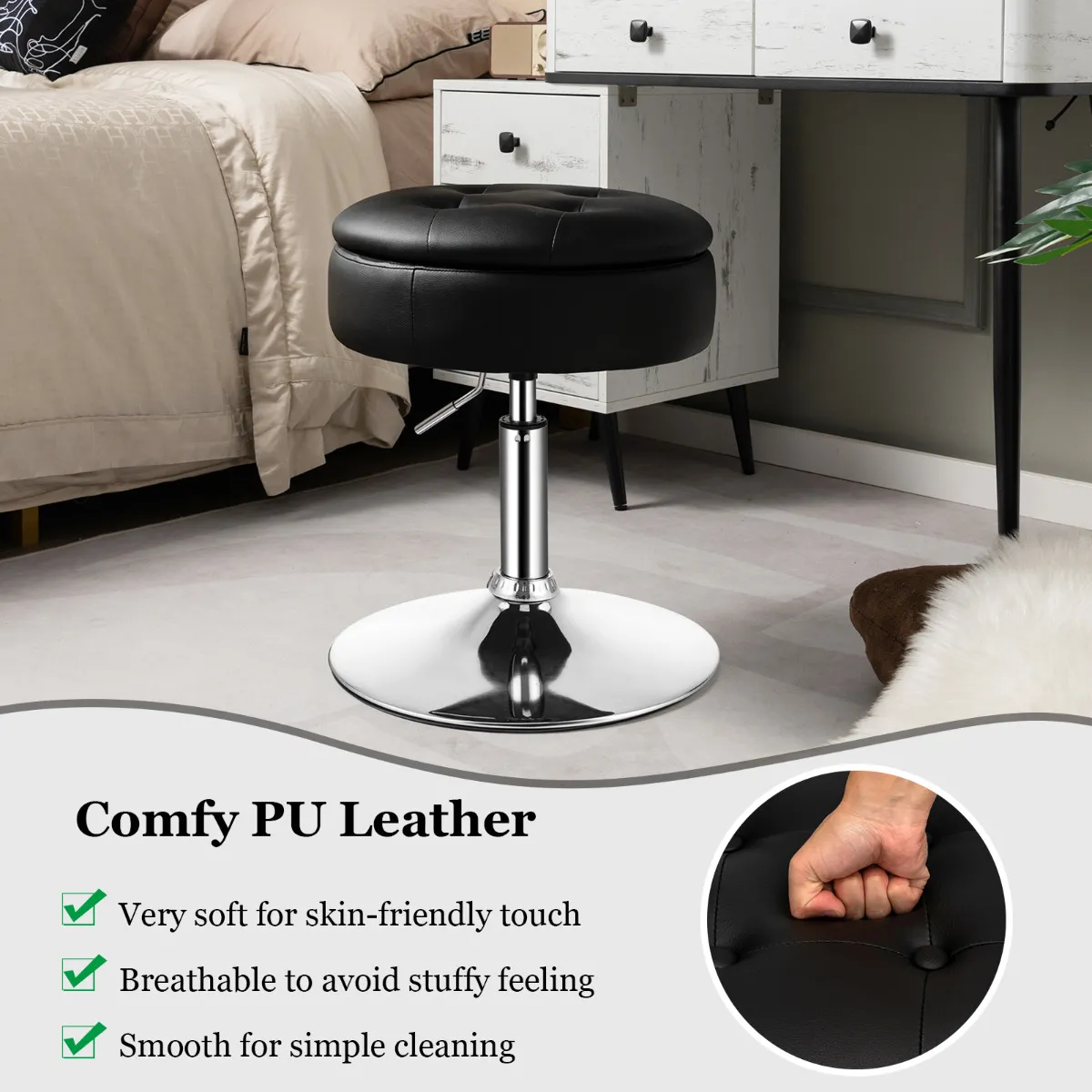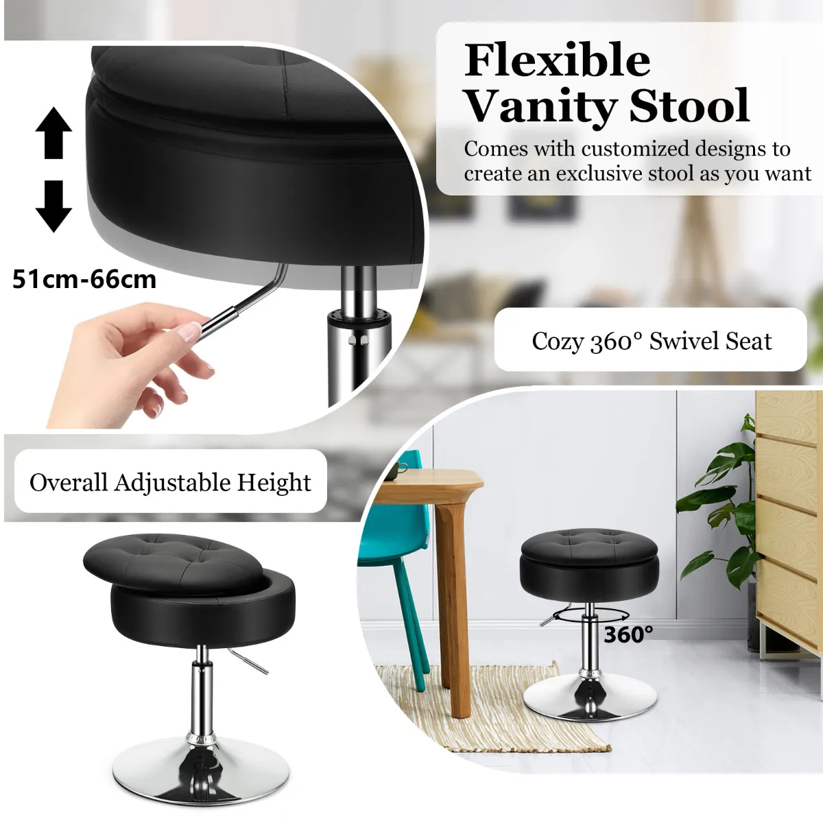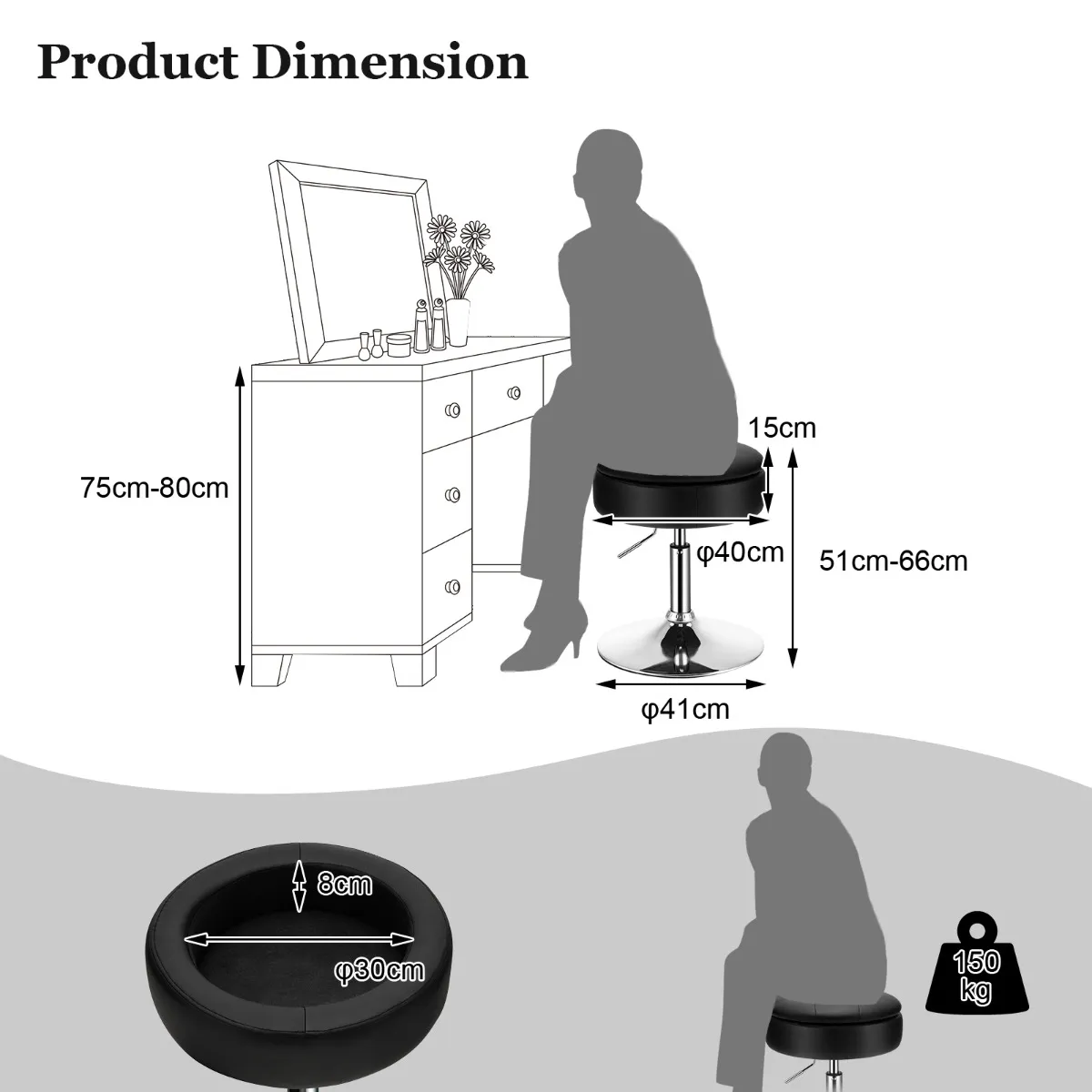 Bent u nog op zoek naar een stijlvolle en veelzijdige badmeubelkruk? Dan is ons product iets voor u! Hij combineert moderne stijl met veelzijdig gebruik en kan worden gebruikt als make-up krukje, opbergpoef, bijzettafel en voetensteun. De zithoogte kan worden aangepast van 51 tot 66 cm volgens uw behoeften. Hij kan 360 graden worden gedraaid, en de bodem is voorzien van een antislip en krasbestendige rubberen ring om uitglijden tijdens het bewegen te voorkomen. Bovendien zorgen de met zachte spons gevoerde zitting en het hoogwaardige PU-leren oppervlak voor optimaal comfort. Het verchroomde onderstel zorgt voor een betrouwbare ondersteuning. Al met al is deze moderne toiletstoel een ideale keuze voor slaapkamer, make-up kamer, woonkamer enzovoort.