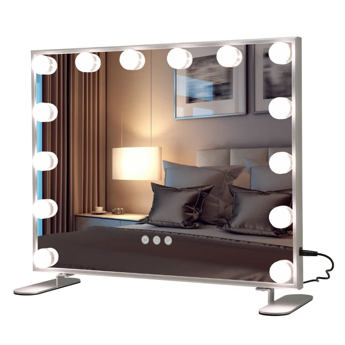 Deze make-upspiegel met LED-verlichting is perfect voor jouw make-upbehoeften! Uitgerust met 14 LED-lampen met een lange levensduur van 50.000 uur, zorgt deze verlichte make-upspiegel voor een lange levensduur. Bovendien kunt u met 3 slimme aanraakschakelaars eenvoudig de lichthelderheid en kleurmodi regelen (warm wit/koel wit/warm geel). De zilveren spiegel met hoge resolutie van 50 cm x 40 cm is ingelijst in een massieve aluminiumlegering, die niet alleen voor heldere reflectie maar ook voor grote stabiliteit zorgt. Bovendien zijn de onderste metalen standaards voorzien van antislipmatten om het tafelblad tegen krassen te beschermen. Ondertussen kun je de onderste standaard verwijderen en deze make-upspiegel indien nodig aan de muur bevestigen. Deze verlichte spiegel is een perfecte aanvulling op uw huis of hotels, make-upstudio’s, kapsalons, enz.