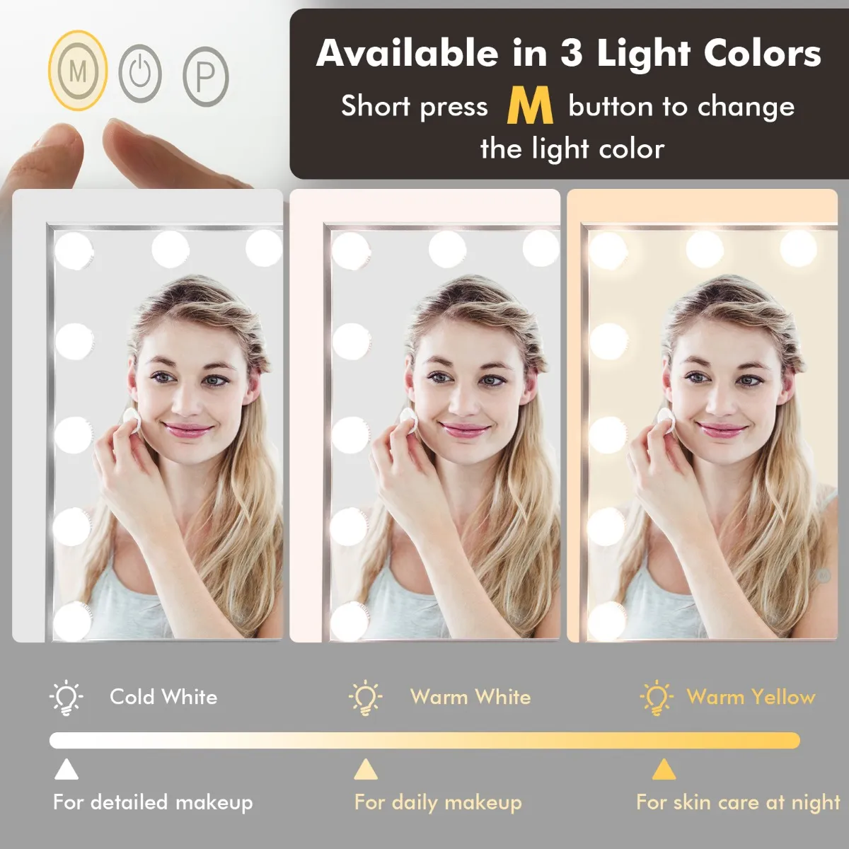 3-kleurenverlichting en instelbare helderheid: Deze make-upspiegel is omgeven door 14 dimbare LED-lampen, waarvan de helderheid traploos kan worden aangepast van 0% tot 100%. Er zijn ook 3 verlichtingskleurmodi waaruit u kunt kiezen: koel wit (6000K), warm wit (4200K) en warm geel (3200K).
