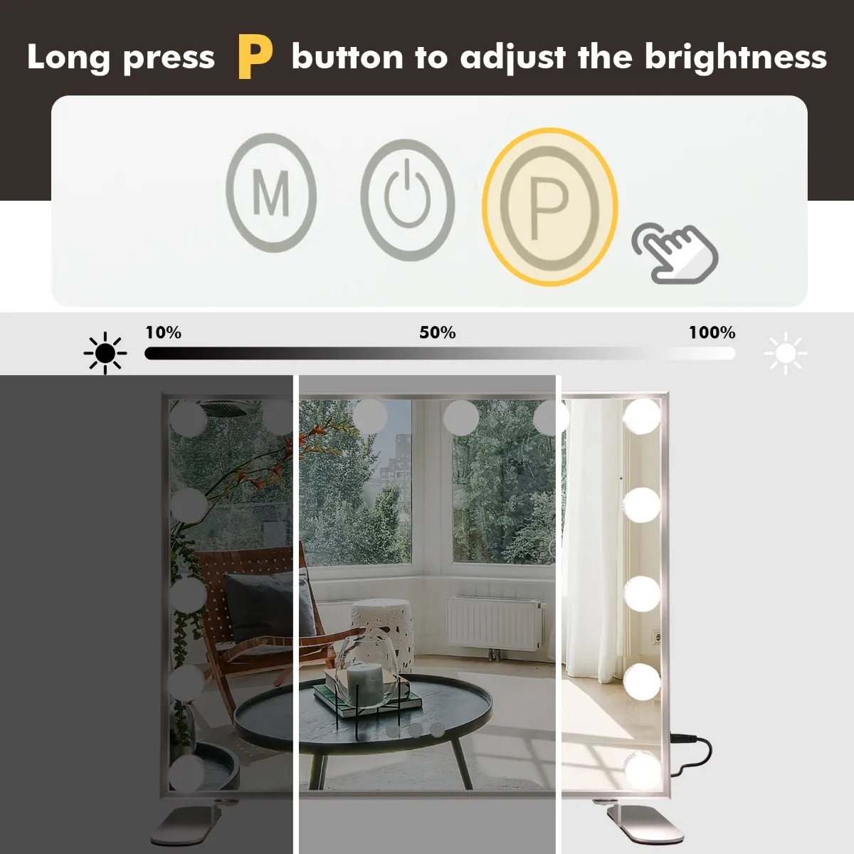 2 manieren om te installeren en slimme bediening: Deze make-upspiegel wordt geleverd met 2 verwijderbare standaards en 2 voorgeboorde gaten, zodat u ervoor kunt kiezen om hem op tafel te plaatsen of aan de muur te bevestigen. Daarnaast beschikt de spiegel over 3 touchknoppen voor eenvoudige bediening: aan/uitknop; Druk kort op de “M”-knop om de lichtkleur te wijzigen. Druk lang op de “P”-knop om de helderheid aan te passen.