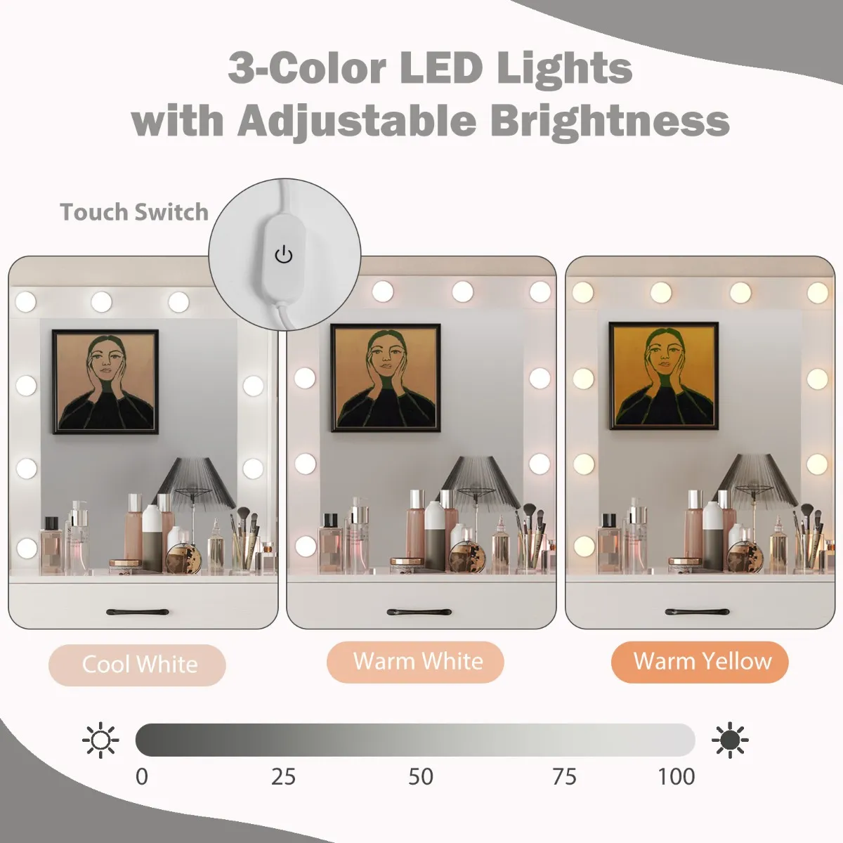 【High-definition LED-spiegel】: De lichtspiegel heeft 3-kleurige LED-lampjes met instelbare helderheid en een aanraakgevoelige schakelaar, die warmgele, warmwitte of koelwitte verlichting bieden naargelang jouw behoeften.