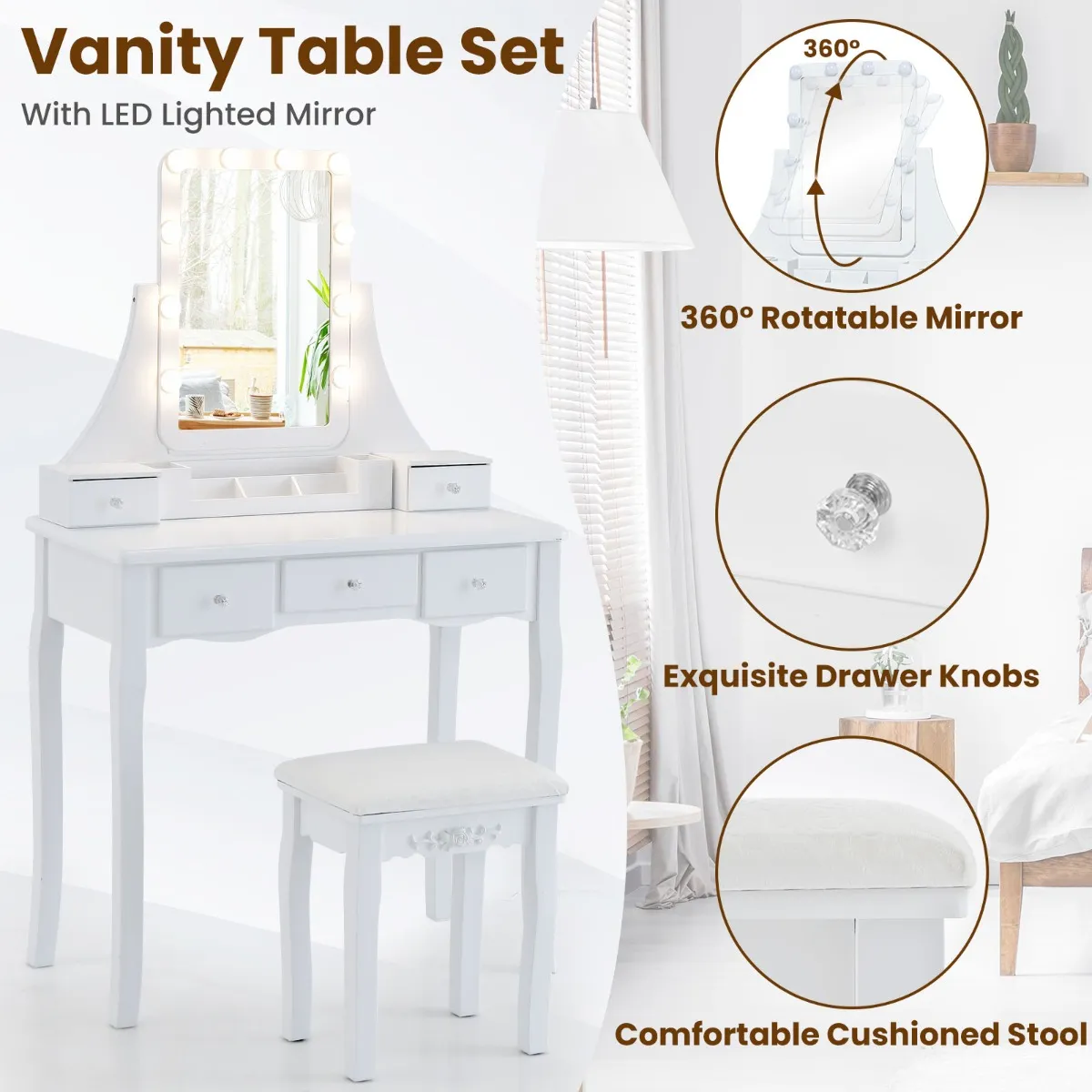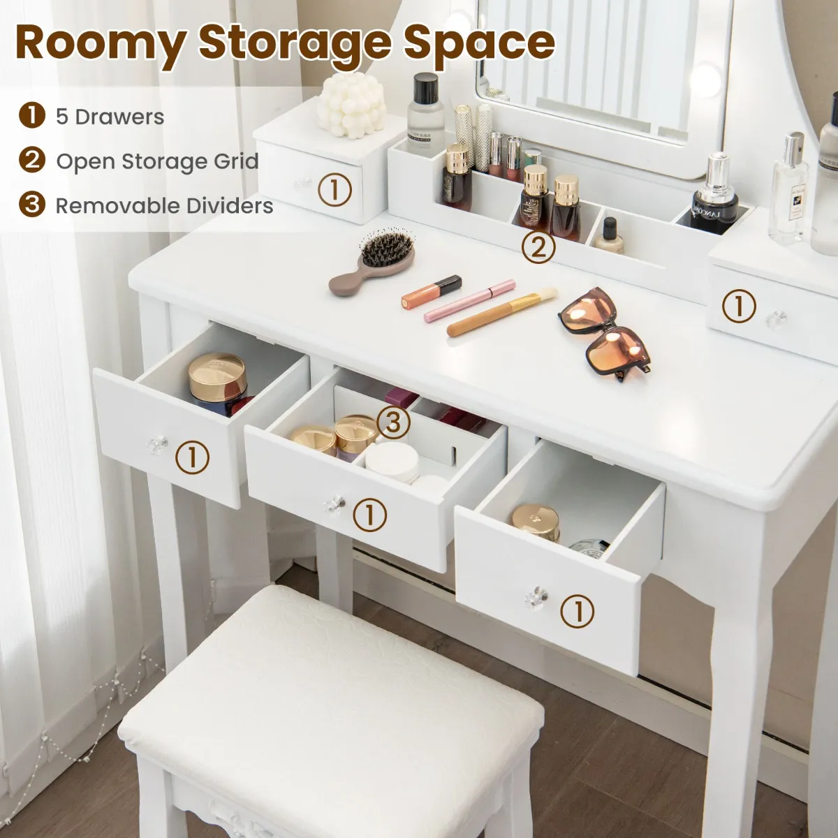 Deze make-uptafelset is een geweldig cadeau voor uw moeder, vrouw, dochter en vriendinnen! Deze make-uptafel is uitgerust met een roterende LED-verlichte spiegel met 3 kleurstanden en instelbare helderheid. De bediening is eenvoudig met een aanraakschakelaar. Dankzij de 5 lades heeft u voldoende ruimte om uw cosmetica, huidverzorgingsproducten, sieraden en meer op te bergen en te ordenen. Deze make-uptafel is gemaakt van massief houten poten en is daardoor jarenlang duurzaam. Voor extra veiligheid wordt er een anti-kantelvoorziening meegeleverd, waarmee u de tafel aan de muur kunt bevestigen.