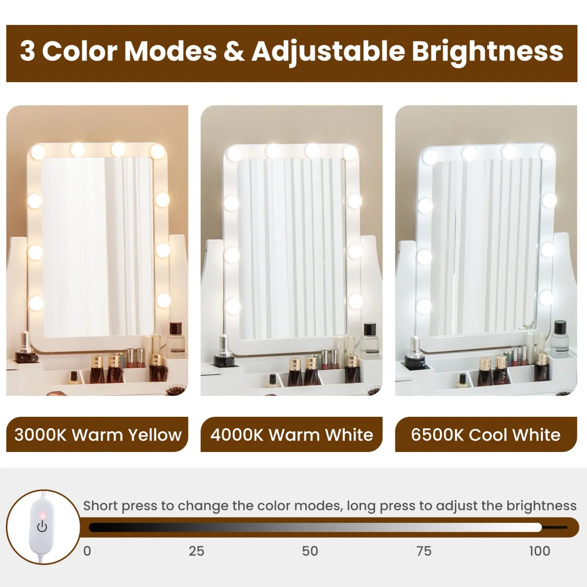 【Gevoelige aanraakschakelaar】: Deze make-uptafel met verlichting is uitgerust met een aanraakschakelaar om de verlichting te bedienen: druk kort op de schakelaar om de verlichting aan/uit te zetten of de kleurmodi te wijzigen, houd de schakelaar ingedrukt om de helderheid van elke kleurmodus aan te passen.