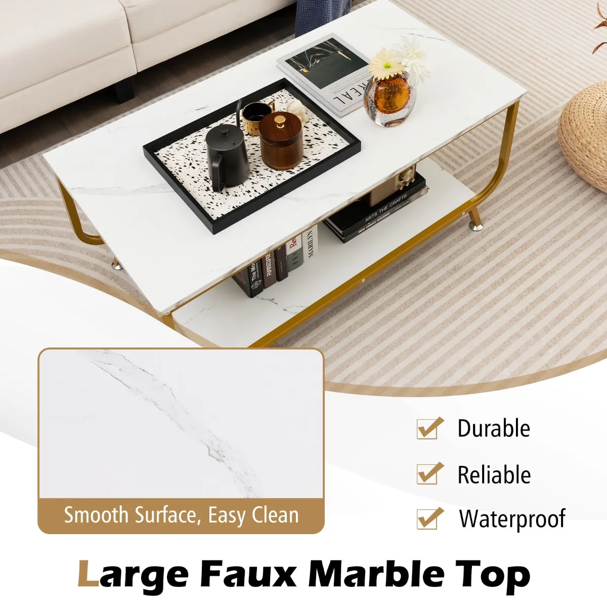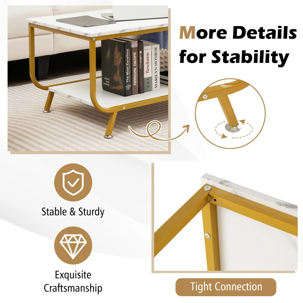 Wanneer u meubels voor uw woonkamer kiest, zal onze moderne salontafel van imitatiemarmer een elegante en luxueuze toets aan uw ruimte geven ! Onze salontafel is gemaakt van hoogwaardig kunstmarmeren blad en een stevig metalen frame en heeft een hoge sterkte en stabiele structuur. Het ontwerp met twee niveaus biedt extra opslagruimte voor weergave en opslag. De eenvoudige, elegante en stijlvolle uitstraling past goed bij jouw huisstijl!