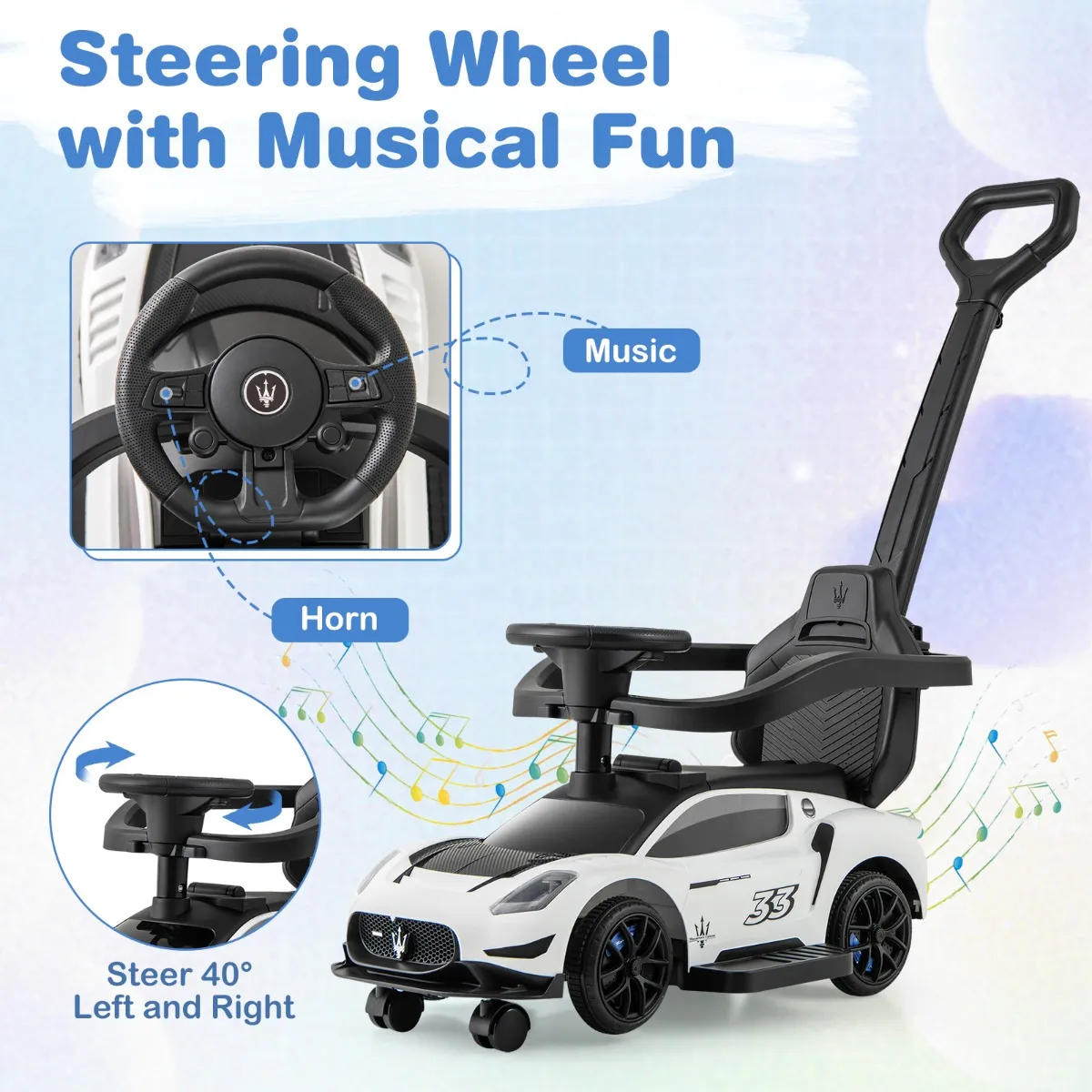 Deze door Maserati gelicentieerde duwauto biedt luxe met een muzikaal stuur. Veiligheid staat voorop met een beschermende barrière en anti-rolrand. Kwaliteitswielen zorgen voor een soepele rit op elk terrein. Hij heeft een stuur met haak, een comfortabele rugleuning en een praktisch pedaal. Hij zorgt niet alleen voor vermaak, maar bevordert ook goede gewoonten dankzij de opbergruimte onder de stoel. Deze auto is een ideaal cadeau voor jonge ontdekkingsreizigers van 18 tot 60 maanden en is een stijlvolle en veilige keuze.