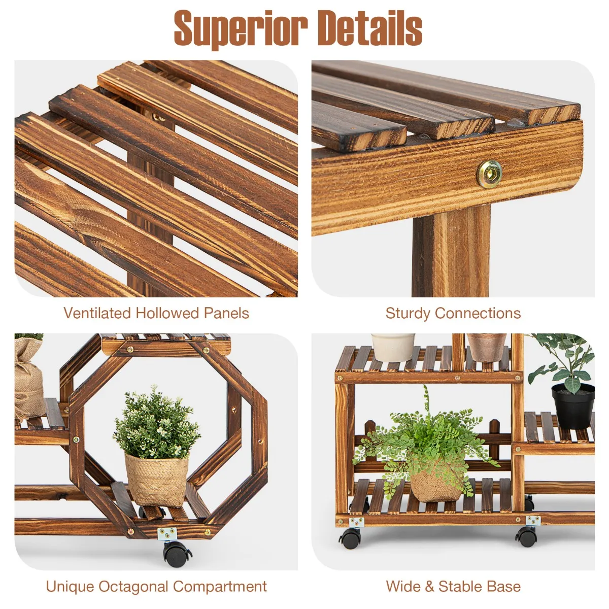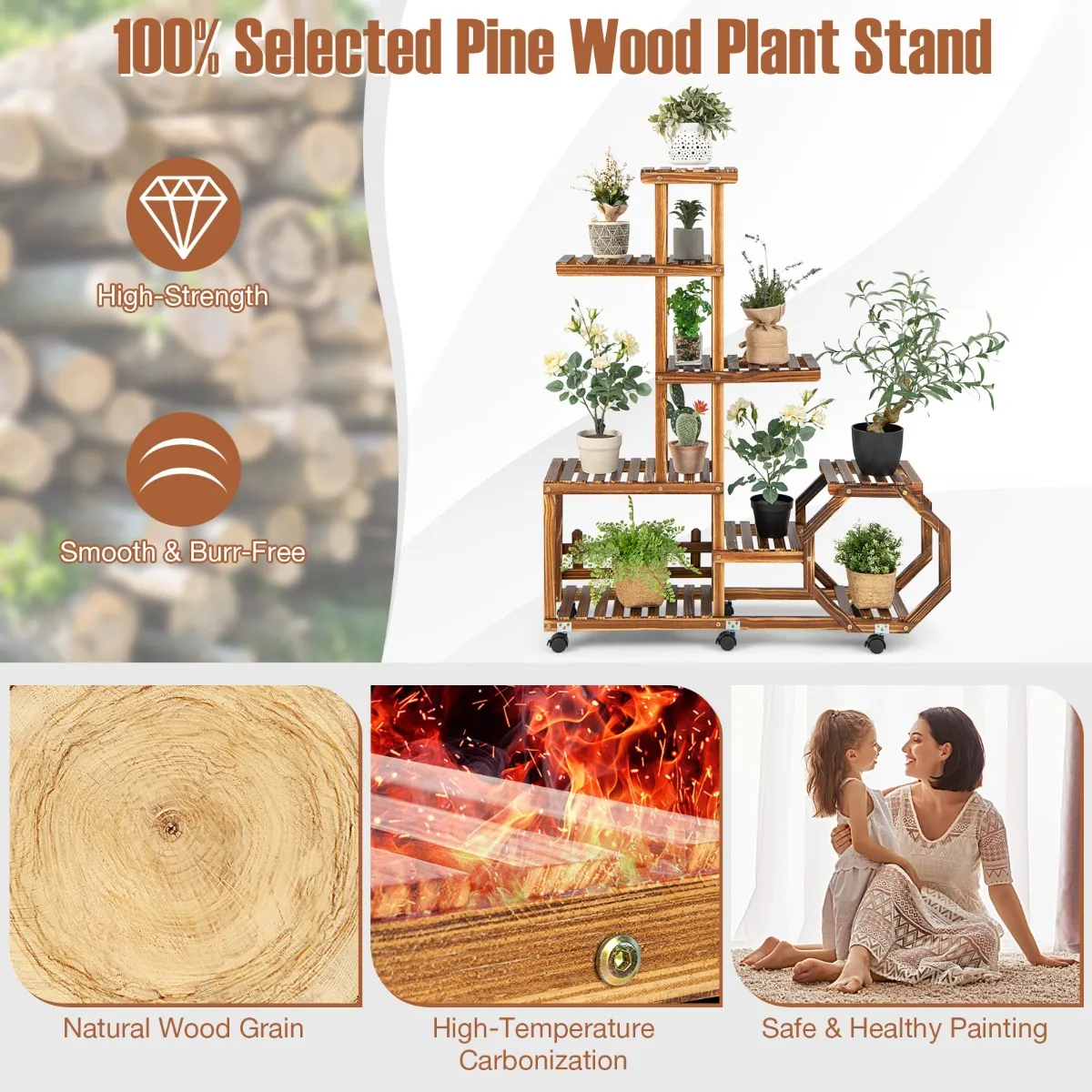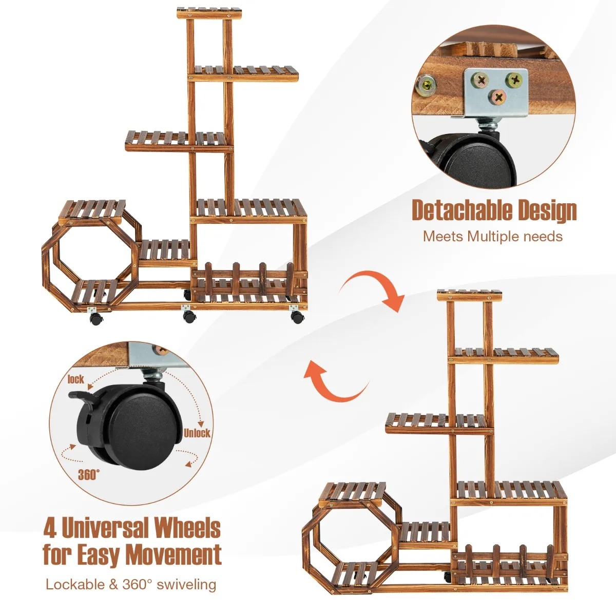 Onze houten plantentribune kenmerkt 8 open planken voor het tonen van mooie bloempotten. De hoog-laag structuur biedt voldoende ruimte voor plantengroei. De bloemenplank is gemaakt van 100% natuurlijk dennenhout en is op hoge temperatuur verkoold om een goede stevigheid en lange levensduur van het product te garanderen. Bovendien zijn er verwijderbare, 360-graden zwenkwielen, zodat u de plank veilig kunt verplaatsen waar u maar wilt; als u hem als eenvoudig vast meubelstuk wilt gebruiken, verwijdert u ze gewoon voor extra stabiliteit.