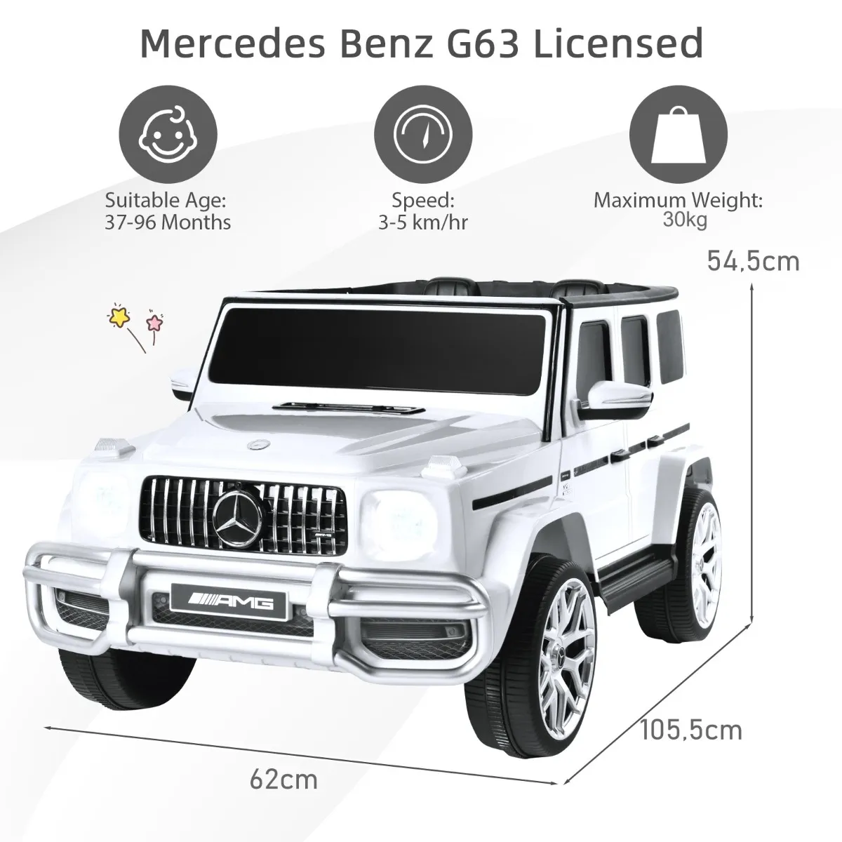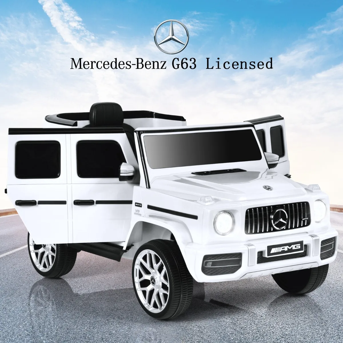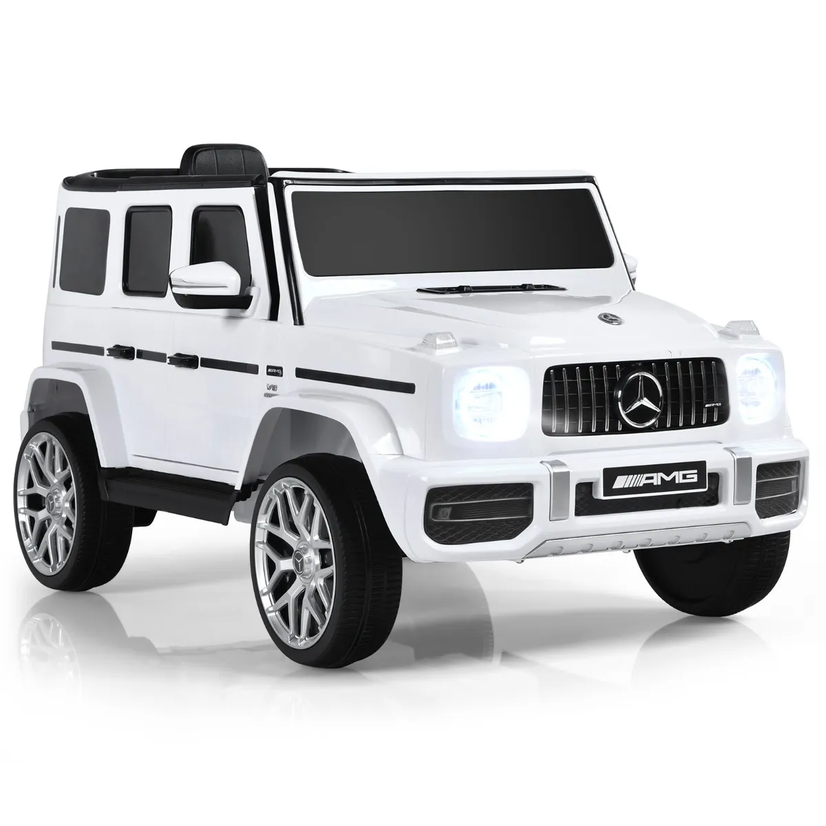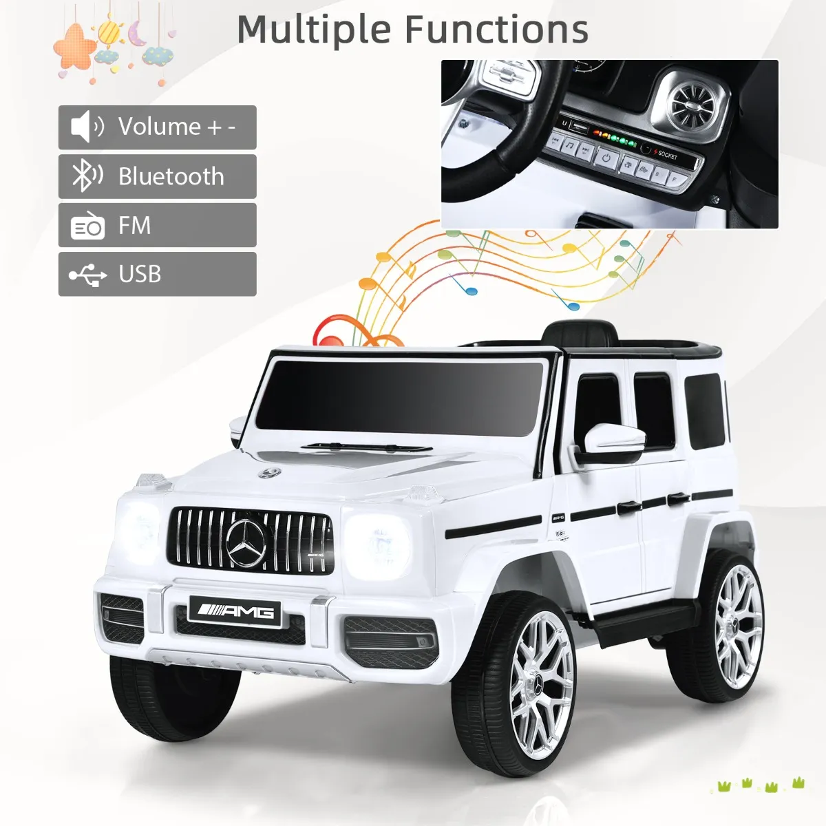 Kinderen kunnen niet alleen genieten van het rijplezier via het stuur en het gaspedaal, maar ook een geweldige tijd hebben met de talrijke mediafuncties (FM/muziek). Het realistische uiterlijk van de modellen van de echte Mercedes-Benz G63 geeft de kinderen een realistisch gevoel, waarbij een 2-modus lichtsysteem de sensatie nog verhoogt.