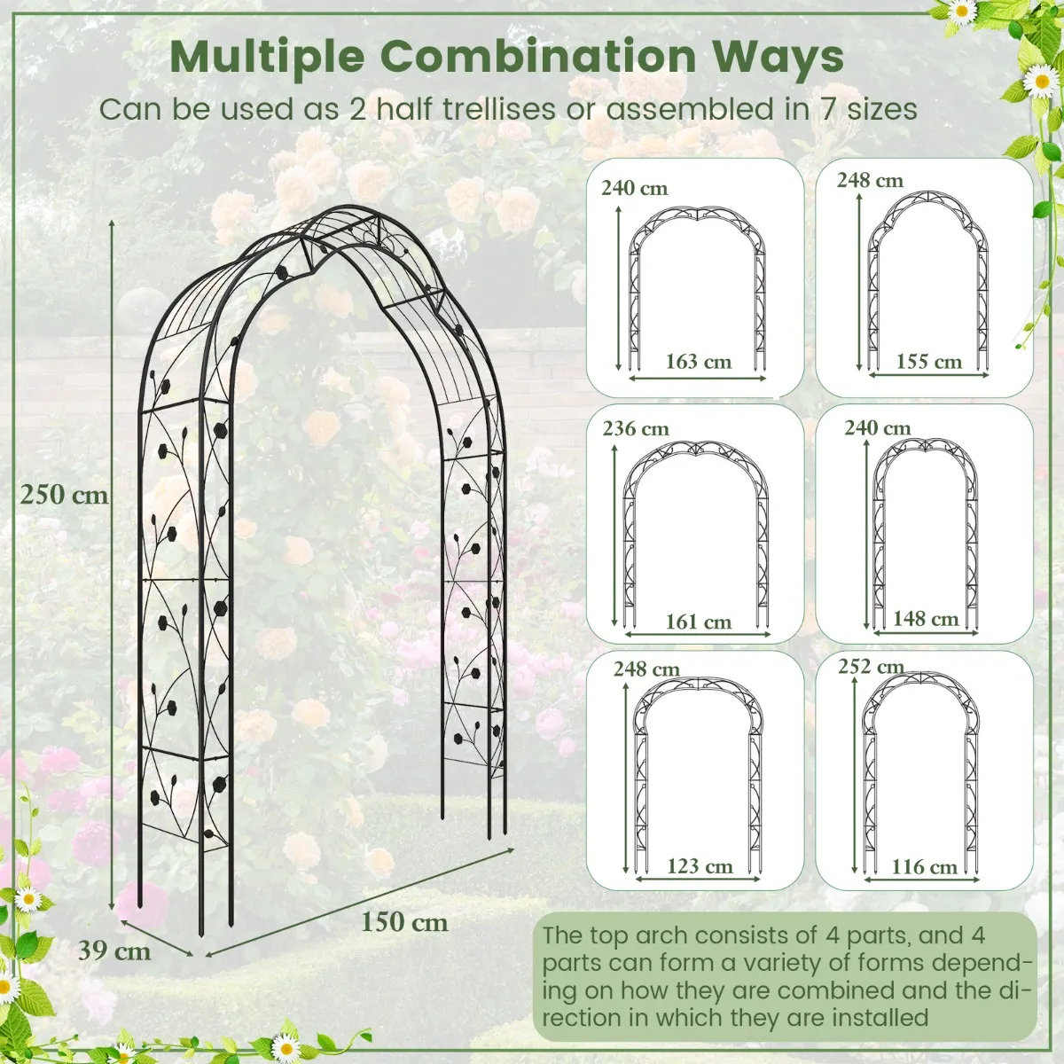 【Verschillende manieren om te combineren】De tuinrellis bestaat uit 2 halve bogen, die kunnen worden gebruikt als 2 halverellissen of kunnen worden samengevoegd in 7 opstellingen. De bovenste boog bestaat uit 4 delen en kan verschillende vormen aannemen, afhankelijk van hoe ze gecombineerd worden en de richting waarin ze geïnstalleerd worden.