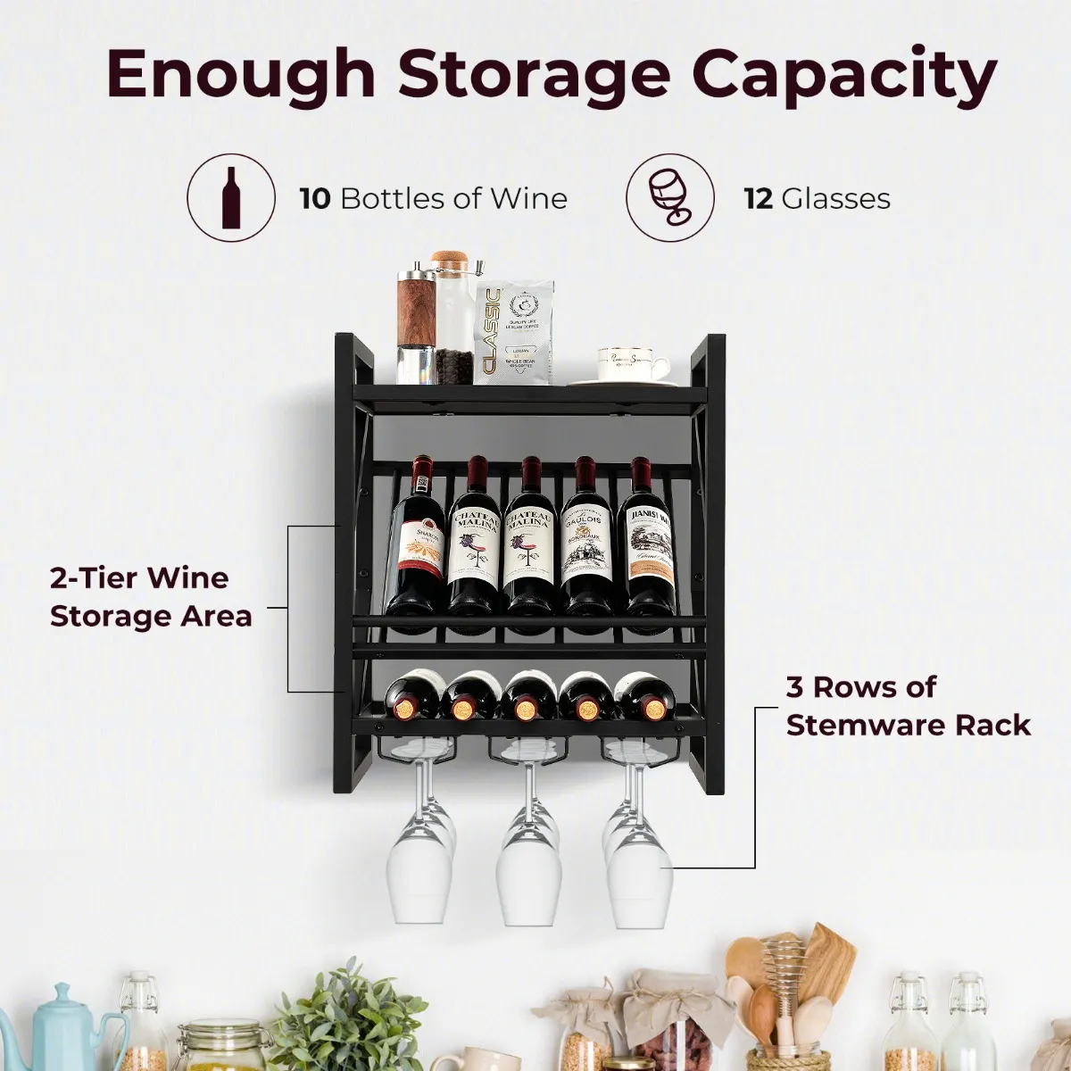Voldoende opbergruimte: Onze wandwijnhouder beschikt over een 2-traps wijnopslagruimte voor 10 wijnflessen en 3 rijen wijnglashouders voor 12 glazen. Bovendien biedt het brede bovenste rek extra opbergruimte voor je potplanten, boeken, kopjes of fotoalbums.