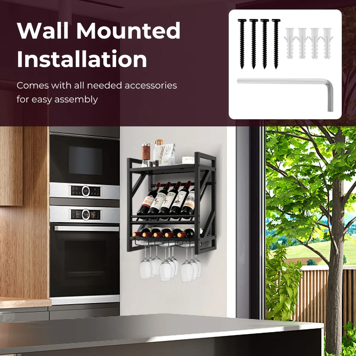 Wandgemonteerd wijnrek: Met 4 uitbreidingsschroeven en 1 inbussleutel kan dit wandgemonteerde wijnrek stevig aan de muur worden bevestigd. Het wijnrek neemt daarom geen vloerruimte in beslag en creëert extra opbergruimte op verschillende plaatsen.