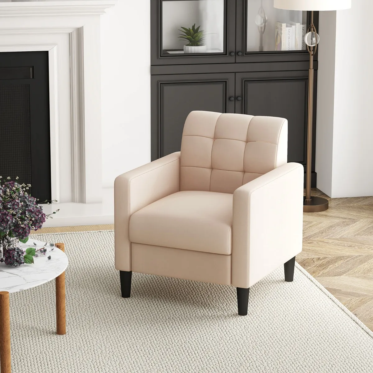 Elegante esthetiek uit het midden van de eeuw: Deze moderne fauteuil uit het midden van de eeuw heeft een verfijnd ontwerp met een getufte rugleuning. Het combineert vintage charme naadloos met eigentijdse flair, waardoor het een stijlvolle toevoeging is aan elke woonruimte.
