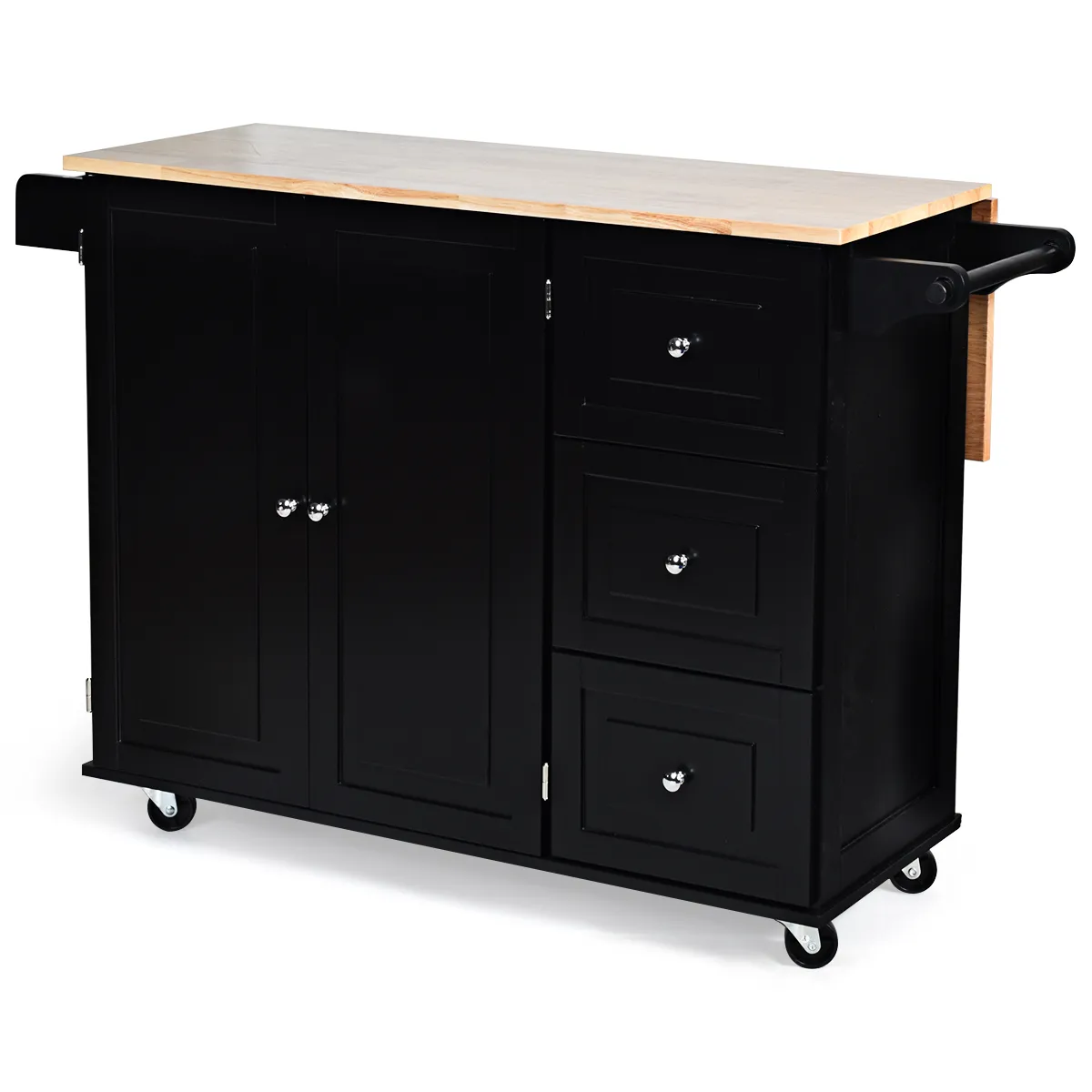 Door de grote opbergruimte kan onze keukentrolley echt een handig opbergmeubel voor je zijn. Met zijn 3 grote lades, een tweedeurs kast en een ruim kruidenrek aan de zijkant houd je je spullen overzichtelijk. Bovendien kan het opvouwbare werkblad worden verlengd of verlaagd om te voldoen aan de behoefte aan een groter werkoppervlak of om klein te zijn voor eenvoudige opslag. Van de 4 universele rubberen wielen zijn er 2 uitgerust met remmen, wat de keukenwagen een hoge mobiliteit geeft, waardoor hij overal kan worden verplaatst en gemakkelijk kan worden gestopt. Handdoeken kunnen eenvoudig worden geplaatst op de afneembare handdoekhouder aan de zijkant van de keukentrolley, die tevens dienst doet als handgreep voor een gemakkelijke hantering van de kar.