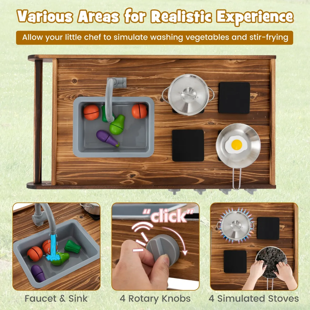 【Creatieve keuken voor kinderen】: Onze buitenkeuken bevat 4 gesimuleerde fornuizen, 4 draaiknoppen, 1 kraan en 1 gootsteen zodat kinderen kunnen doen alsof ze eten bereiden met modder en water. Voor een realistischere ervaring worden er ook 1 koekenpan en 1 steelpan meegeleverd, zodat kinderen maaltijden beter kunnen simuleren.