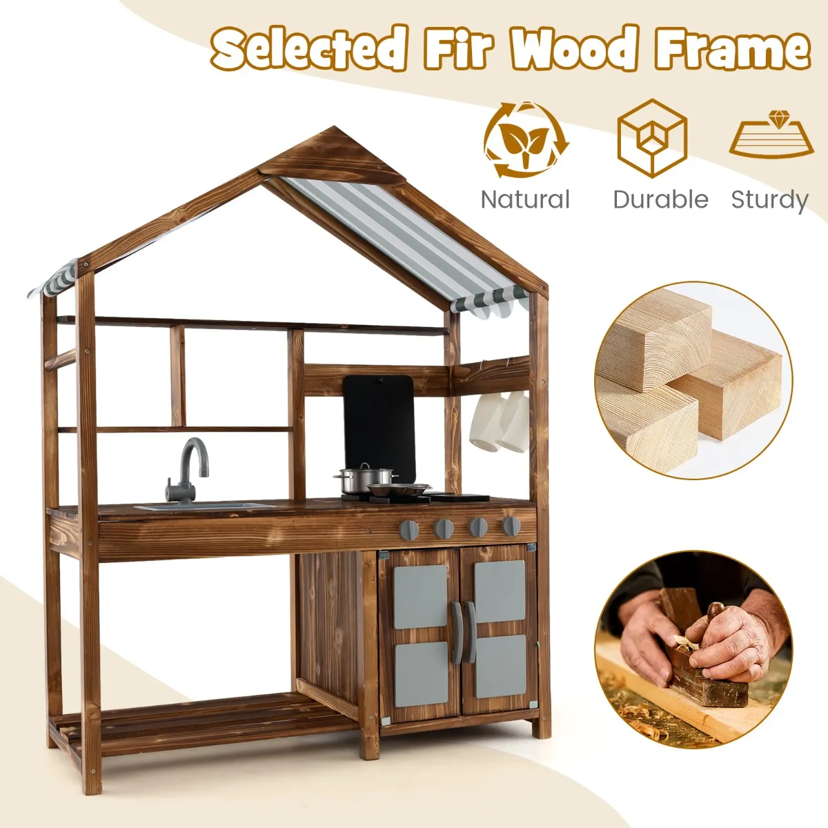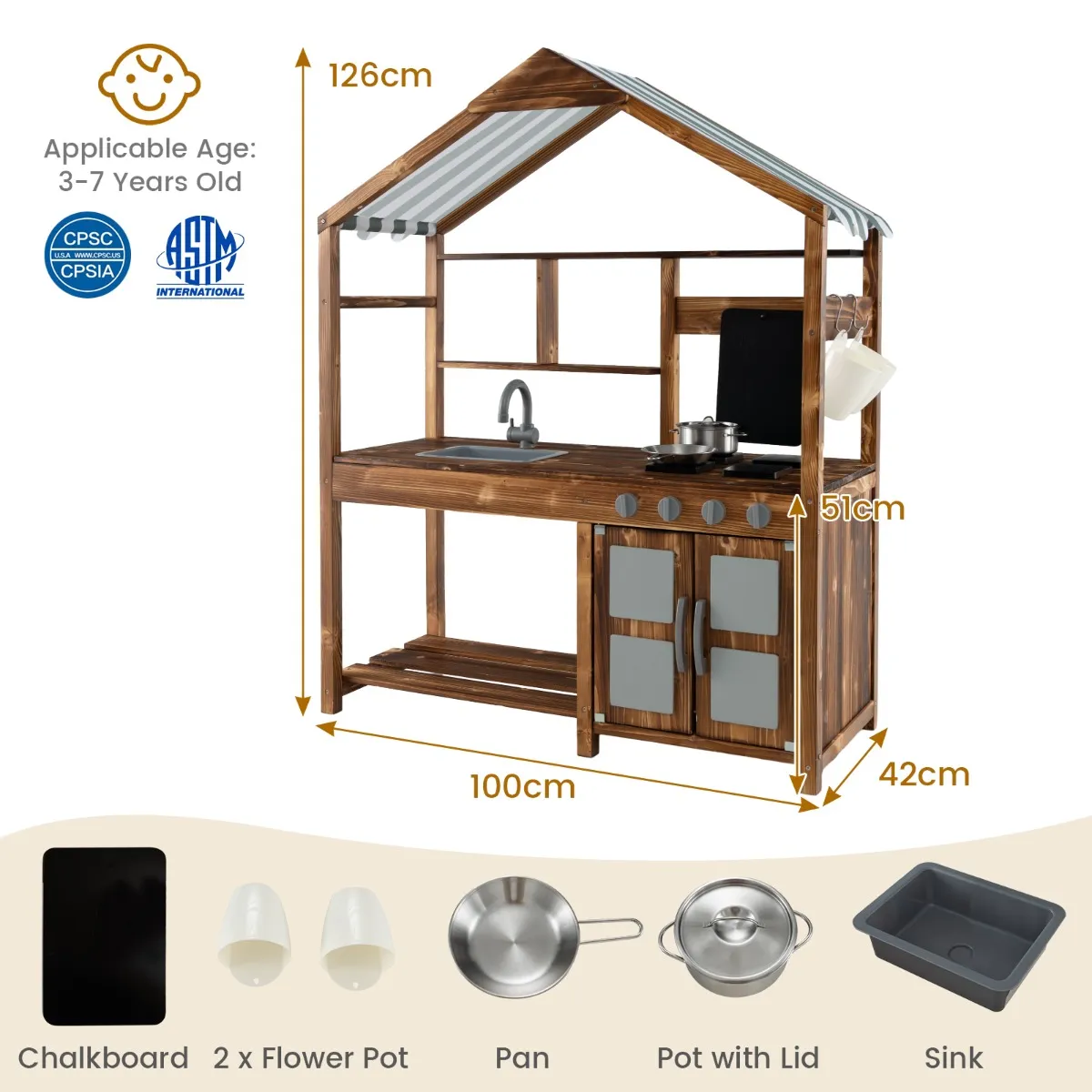 Je kleine lieveling kan op het bord schrijven of tekenen, modder of zand in de gootsteen mengen en vervolgens met het kookgerei koken. De draaibare knoppen produceren ook “klik”-geluiden wanneer kinderen ze draaien, wat hen een realistischer kookervaring biedt. De bovenste opbergvakken, ophanghaken, lattenplank en kast zijn inbegrepen voor een grotere verscheidenheid aan opbergmogelijkheden. Er is vooral een overkapping om de harde zomerhitte af te schermen en de kinderen een koele en aangename plek te bieden om te spelen. Het hoogwaardige dennenhoutmateriaal maakt het duurzaam en stabiel. Het wordt ook geleverd met accessoires voor kinderen om ermee te spelen.