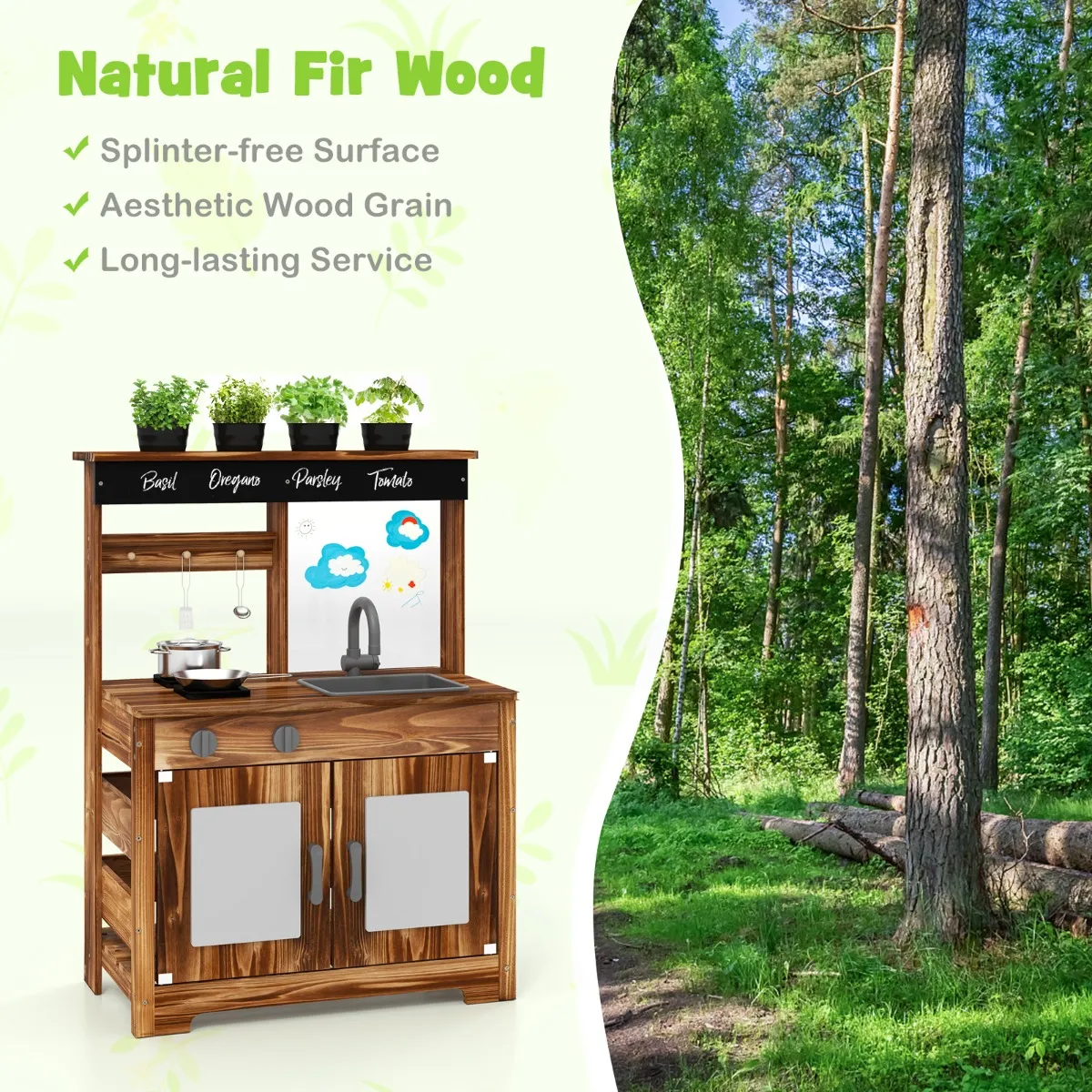 【Verstelbare modderkeuken】: Deze houten speelkeuken wordt geleverd met een doe-het-zelf acrylbord en maakt het mogelijk om hun kookruimte te personaliseren en hun speelruimte over te nemen. Kinderen kunnen vrienden uitnodigen om deel te nemen aan hun individuele keukenspeelset, wat sociale interacties bevordert.