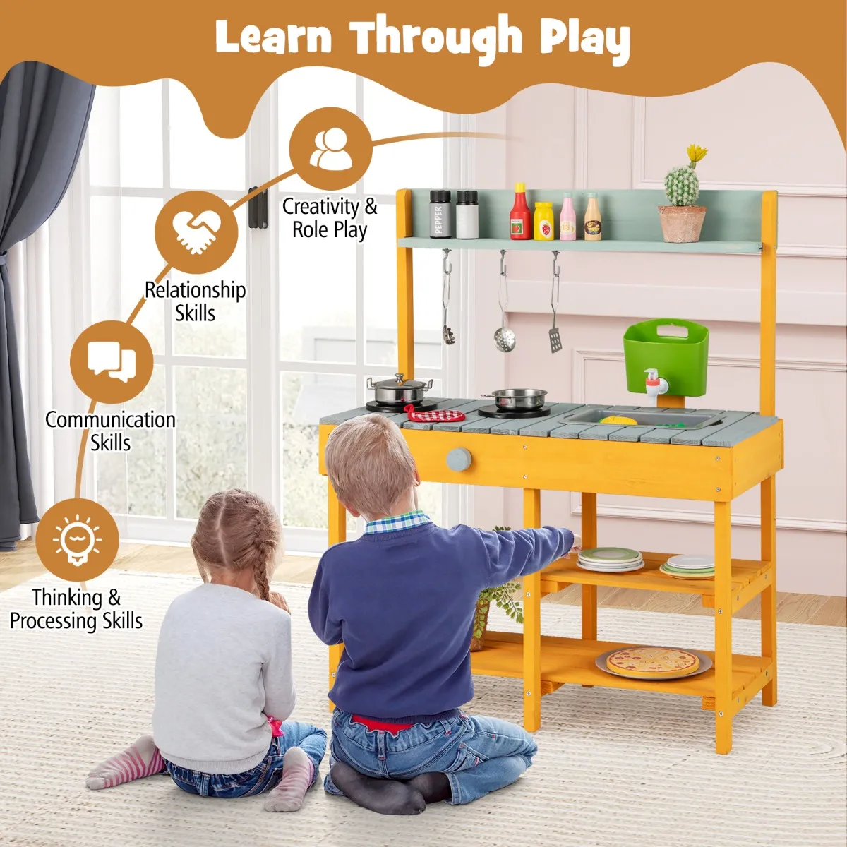 Met de kookplaat en de draaibare knoppen kunnen kinderen als een echte kok koken. 1 bovenste plank, 3 haken om op te hangen en 3 legplanken maken het mogelijk om het organiseren van je voorwerpen te leren. Aan de andere kant maken de waterbak, de kraan en de wastafel het tot een vrolijke plek voor peuters waar ze kunnen genieten van modder of waterspelen. Bovendien bestaat de hele speelkeukenset uit natuurlijk massief hout.