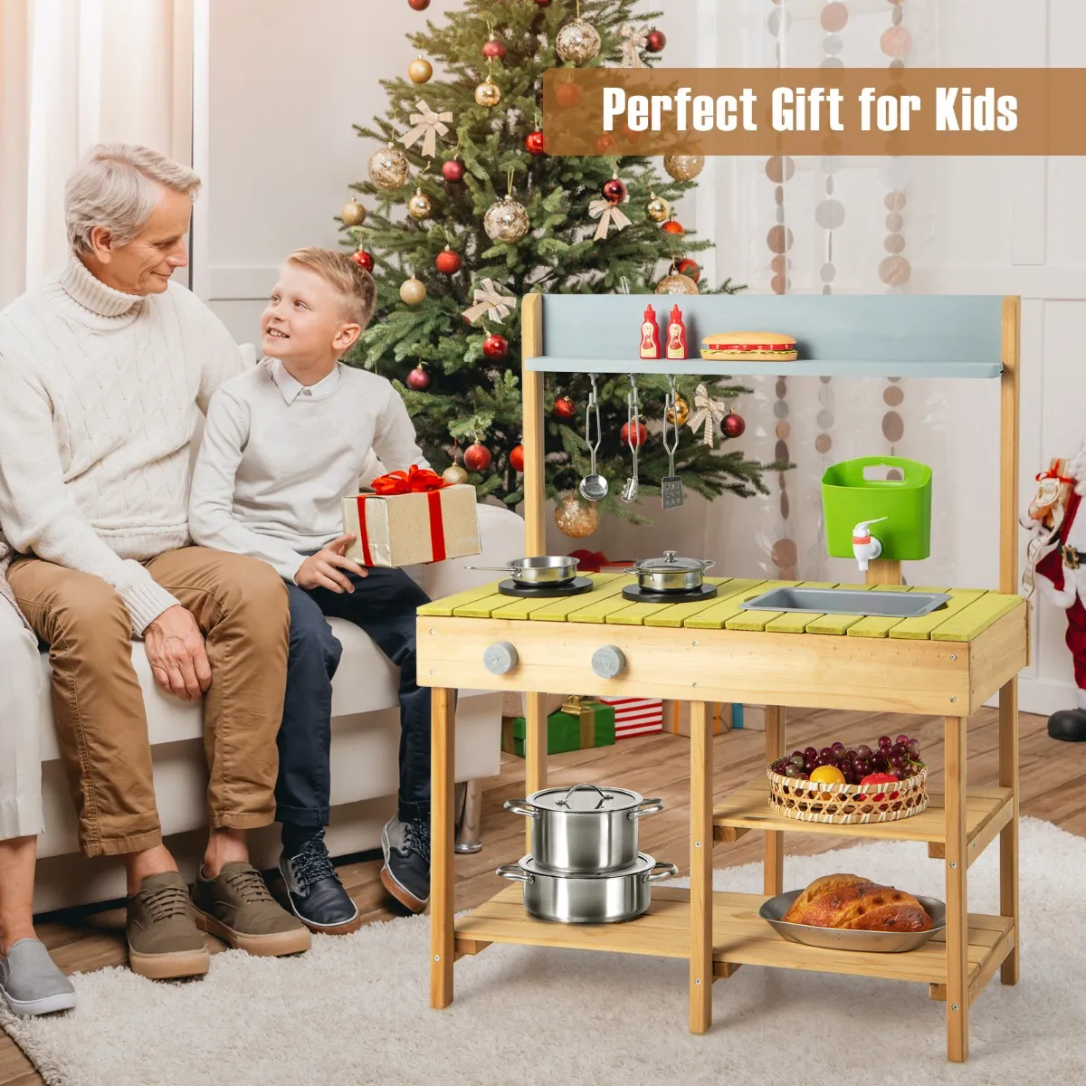 【Kindervriendelijk massief hout】: Geselecteerd dennenhoutmateriaal garandeert grote robuustheid en uitstekende duurzaamheid. Ondersteund door 4 stabiele poten blijft onze modderkeuken stabiel en wiebelt niet zo gemakkelijk. Ronde hoeken voorkomen stoten.