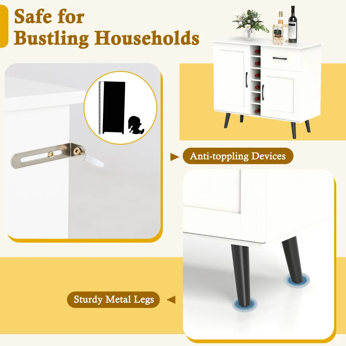 【Verbeterde veiligheid】: Dankzij de taps toelopende metalen poten staat onze robuuste wijnkast garant voor perfecte balans en stabiliteit. Bovendien is de rolstoel uitgerust met 2 anti-kantelvoorzieningen, waardoor hij veilig is in moderne, drukke huishoudens met kinderen of huisdieren.
