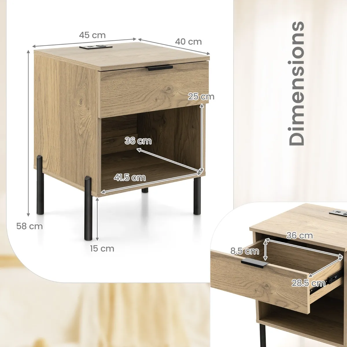 Laad je apparaten in stijl op met ons moderne mid-century nachtkastje! Dit functionele meubel heeft een geïntegreerd oplaadstation met een stopcontact en 2 USB-poorten, zodat je apparaten altijd bij de hand en volledig opgeladen zijn. Bovendien heb je met de ruime lade en het open vak genoeg ruimte om je benodigdheden georganiseerd te bewaren. Deze bijzettafel is gemaakt van hoogwaardige materialen en heeft stevige metalen poten, zodat je hem lang kunt gebruiken. Menselijke details, zoals beschermende glijders, zorgen voor een betere ervaring. Mis het niet om je slaapkamer om te toveren in een stijlvolle en functionele oase!