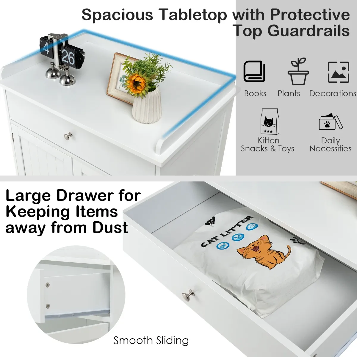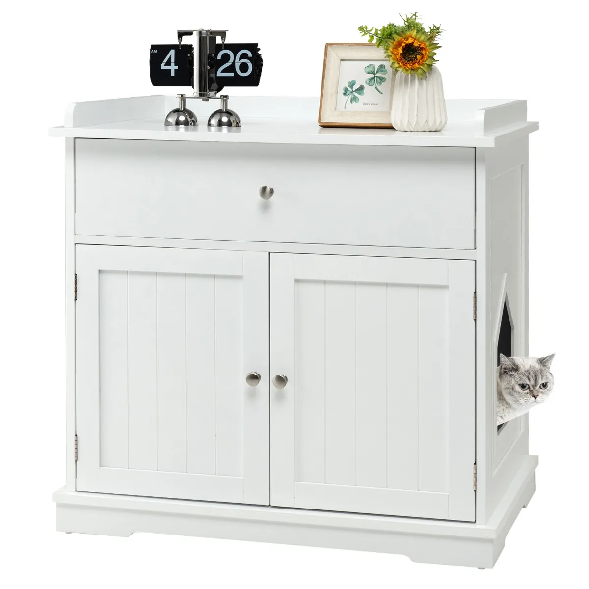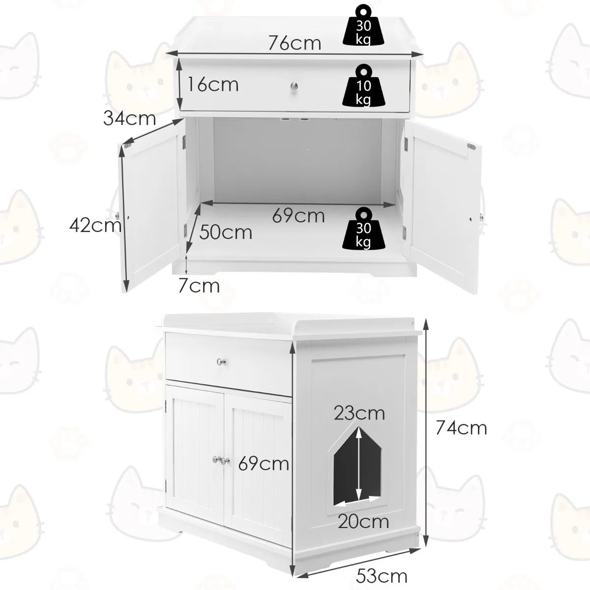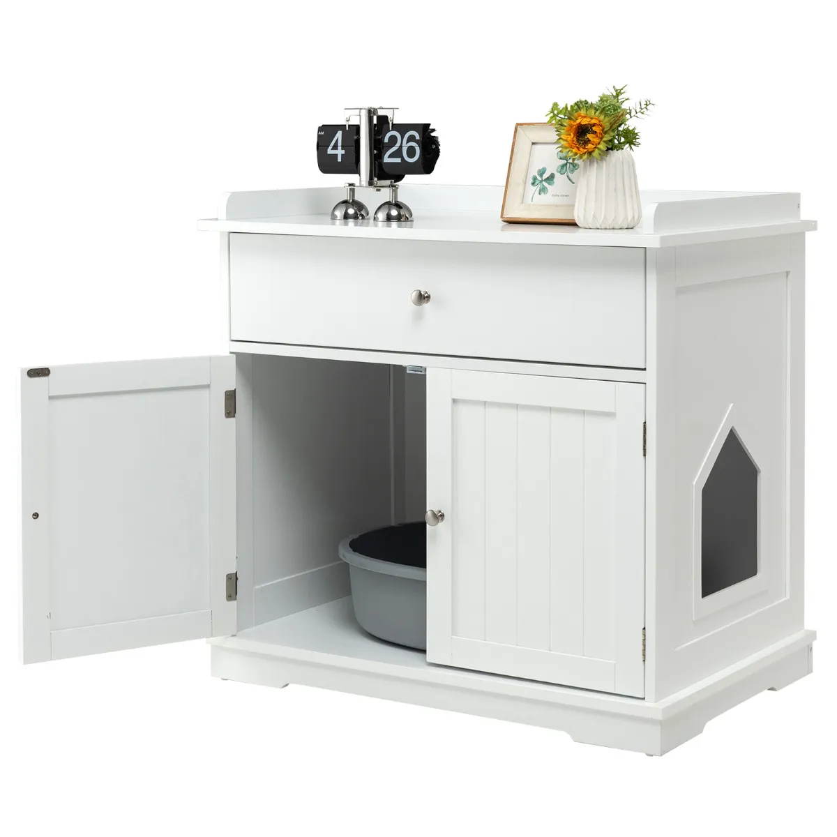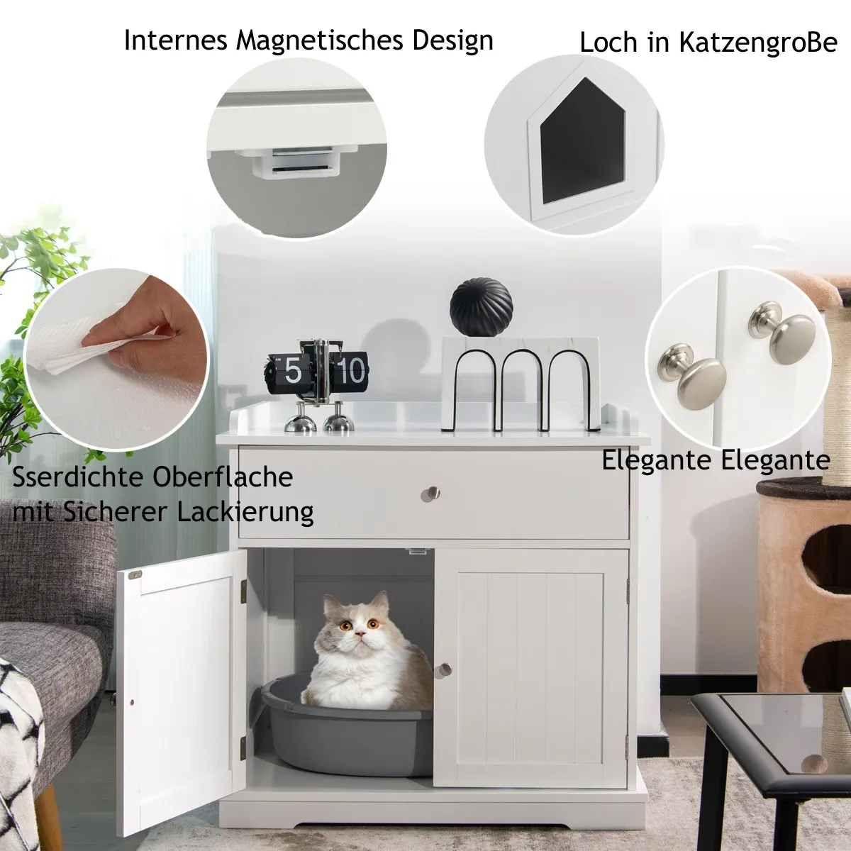 Onze kattenbakbehuizing heeft een gemakkelijk glijdende lade om spullen stofvrij op te bergen en een groot tafelblad met relingen om decoraties uit te stallen en spullen binnen handbereik te houden. En het grote interieur kan worden veranderd in een kattenbak, kattennest of kattenschuilplaats. Het kan niet alleen een praktische kattenbak zijn, maar ook gebruikt worden als bijzettafel, wat comfort brengt in uw dagelijks leven. De kattenbakbehuizing kan de hoeveelheid kattenbakvulling die uw kat uit de kattenbak draagt effectief verminderen, terwijl alle geuren binnen blijven. En er zijn 2 deuren voor gemakkelijke toegang en dagelijkse schoonmaak. Het kan niet alleen privacy bieden aan katten, maar ook uw huis schoon en netjes houden!