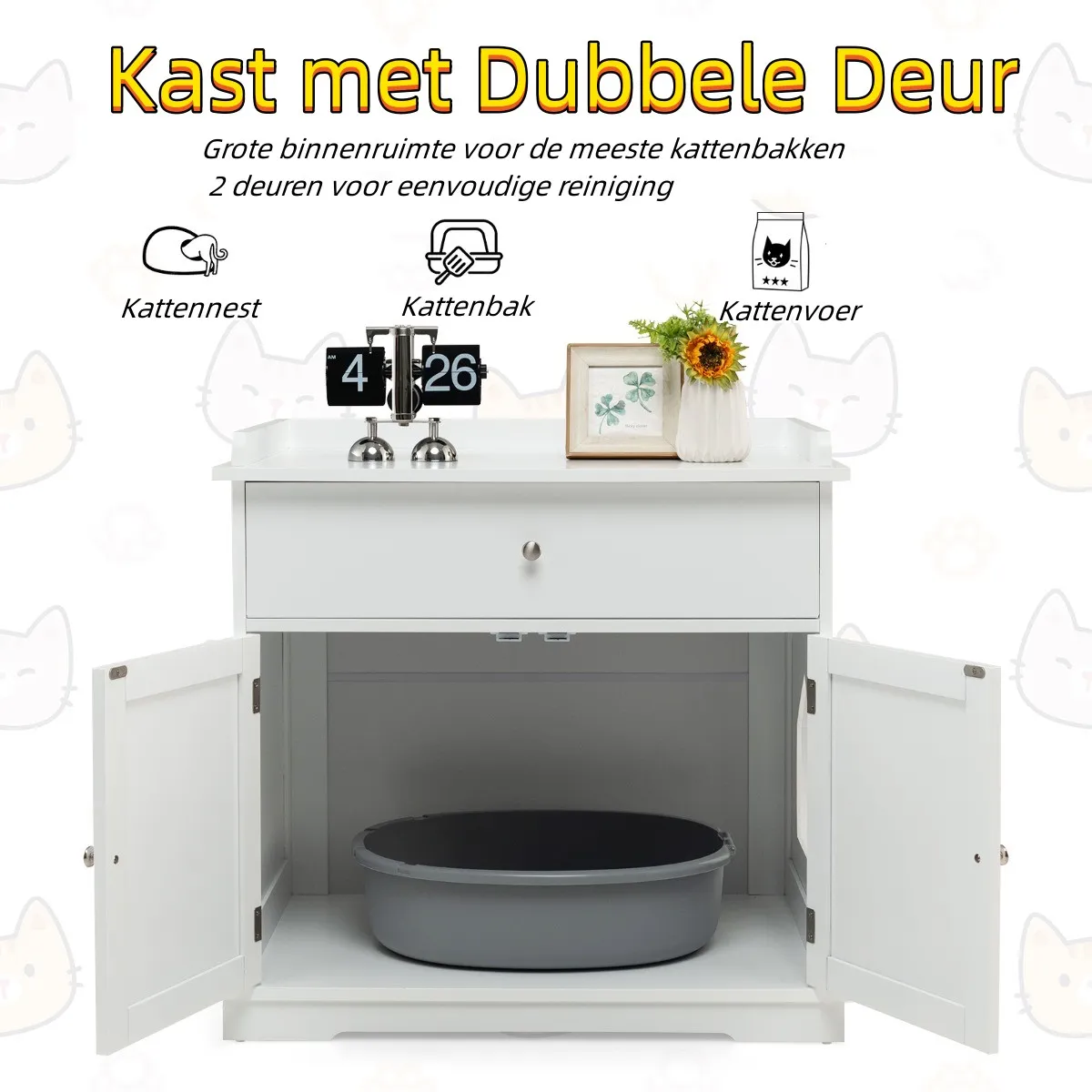 Grote opbergruimte: Het houten kattenhuis is uitgerust met een ruim tafelblad en lade waar u boeken, planten, decoraties, kitty snacks, speelgoed en dagelijkse benodigdheden kunt opbergen om uw kamer schoon en georganiseerd te houden. En de binnenkant meet 69 x 50 x 42 cm (L x B x H), wat geschikt is voor de meeste kattenbakken en kattennesten.