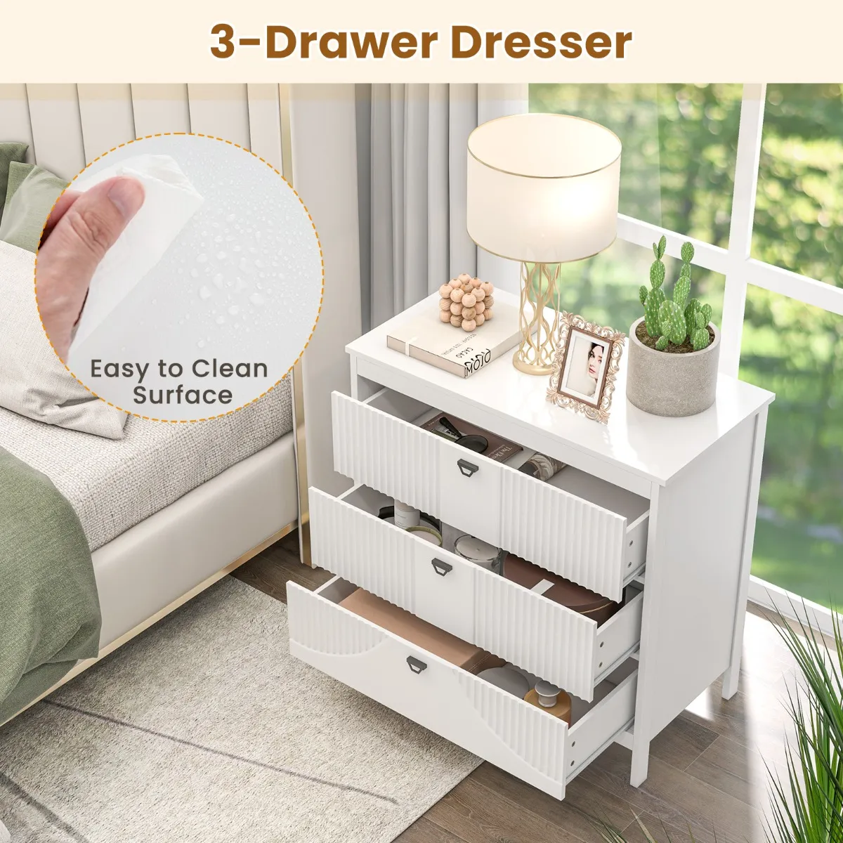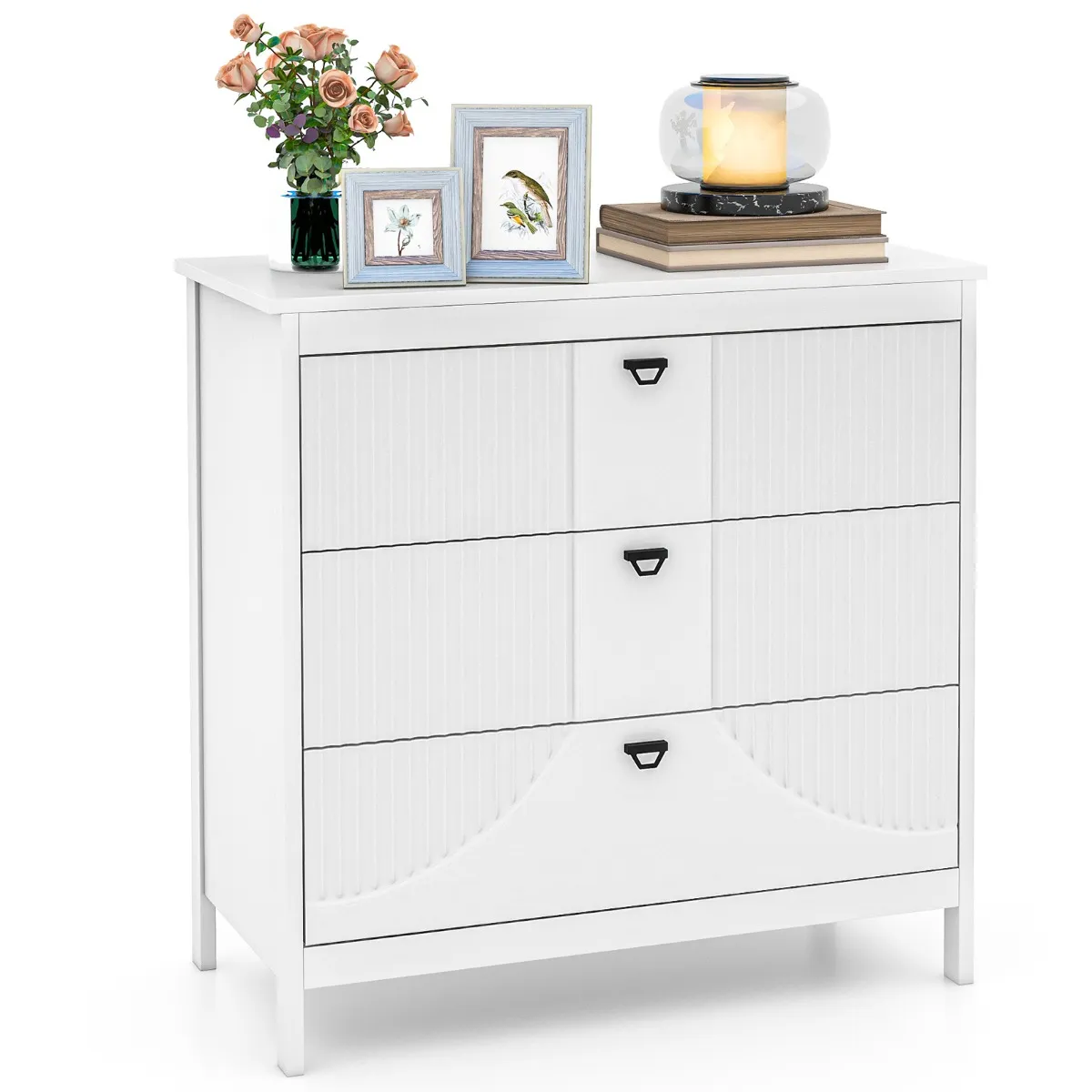 Onze commode heeft 3 praktische uittrekbare lades en een royaal bovenblad, waardoor er genoeg ruimte is om essentiële spullen te organiseren. Het verdikte MDF en de stevige poten zorgen voor langdurig gebruik en kunnen tot 60 kg dragen, wat een stabiele structuur garandeert. Elke lade heeft metalen geleiders voor een soepele werking, aangevuld met stijlvolle handgrepen die verfijning toevoegen. Anti-slip glijders beschermen de vloer tegen krassen en zorgen voor extra stabiliteit. Veelzijdig, past zich aan je behoeften aan.