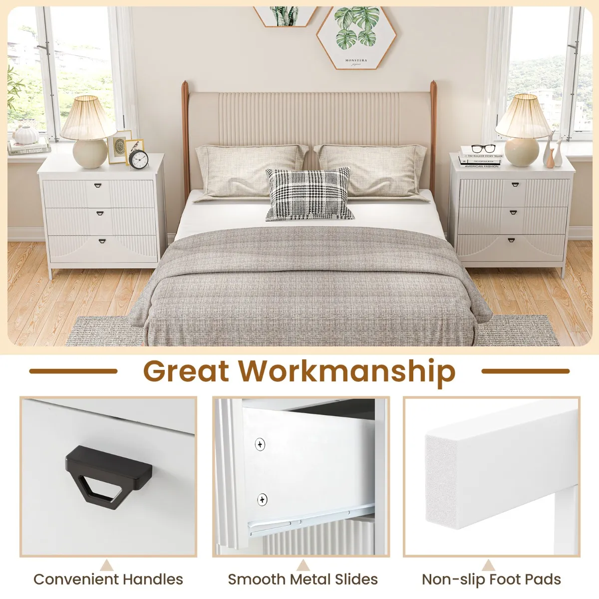 【Aantrekkelijke afwerking】: Elke lade heeft metalen geleiders van hoge kwaliteit voor een soepele werking, terwijl de elegante handgrepen een vleugje verfijning toevoegen. Bovendien beschermen de antislipglijders je vloer tegen krassen, waardoor zowel de functionaliteit als de levensduur van onze ladekast gewaarborgd zijn.
