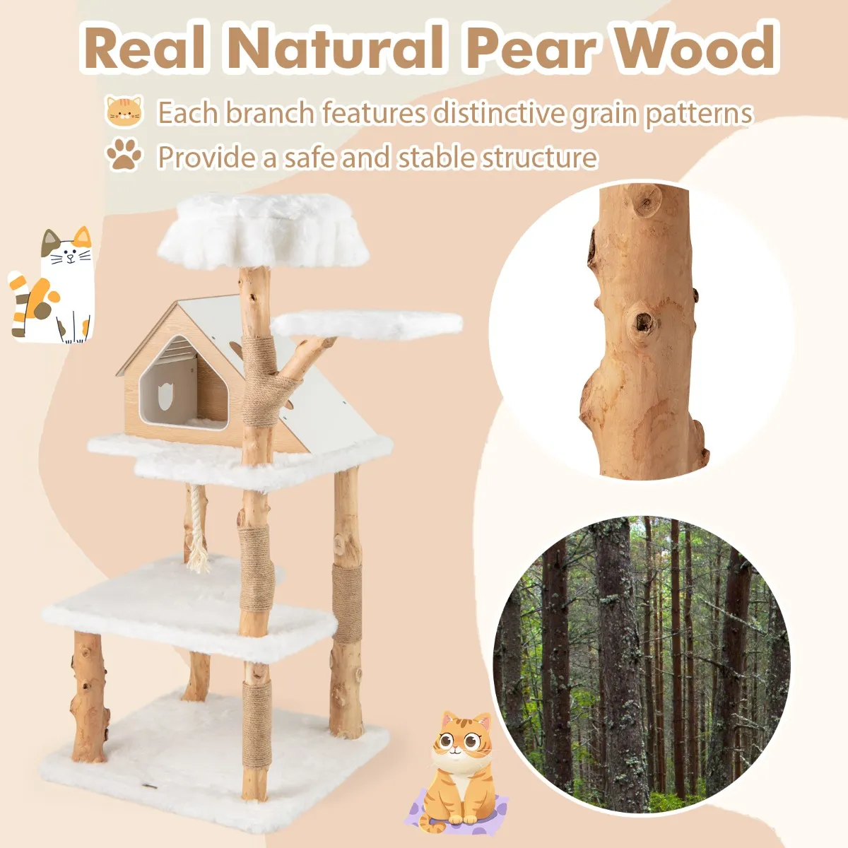 Deze krabpaal is voorzien van natuurlijke perenhouten stammen met unieke nerfpatronen. Deze vergroten niet alleen de esthetische aantrekkingskracht, maar zorgen ook voor een stabiele en veilige constructie. Het beschikt over een huisje in de vorm van een huisje waar je een dutje kunt doen, 2 zitstokken om de omgeving te observeren en 2 ruime platforms om op te loungen. Het beschikt over krabpalen van natuurlijk jute en een hangend sisaltouw. Elk platform is bedekt met een hoogwaardige, lange, pluche stof, die zachtheid en comfort biedt.
