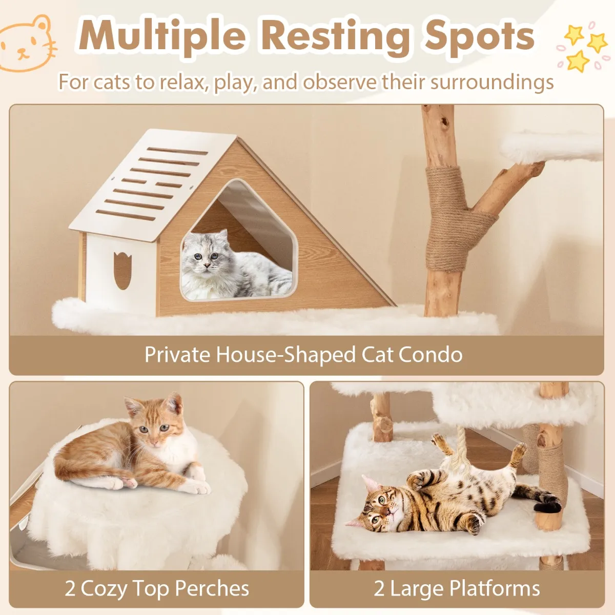 【Meerdere rustplaatsen】: De houten krabpaal biedt verschillende comfortabele plekken voor katten om te ontspannen, spelen en hun omgeving te observeren, zoals een huisvormige condo, 2 comfortabele zitstokken en 2 grote platforms. Er zijn 5 niveaus waar je harige vrienden op en af kunnen klimmen.