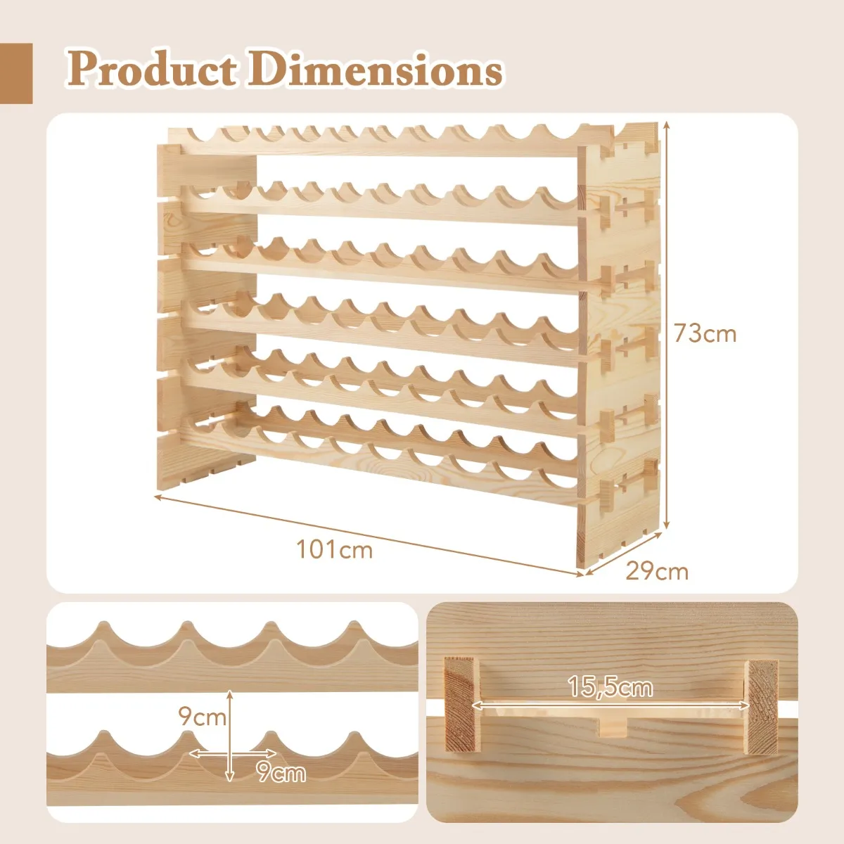 Verbeter je wijnopslag met ons stapelbare modulaire wijnrek. Dit vrijstaande wijnrek van natuurlijk grenenhout heeft een draagvermogen van 160 kg en kan tot 60 flessen van verschillende types bevatten. De gegolfde sleuven houden elke fles stevig vast, terwijl de lichte hellingshoek helpt om optimale versheid te behouden. Het kan zonder gereedschap in elkaar worden gezet en is ontworpen voor eenvoudige aanpassing. Of het nu in een eetkamer, bar of kelder staat, het biedt een stijlvolle en praktische opslagoplossing voor wijnliefhebbers.