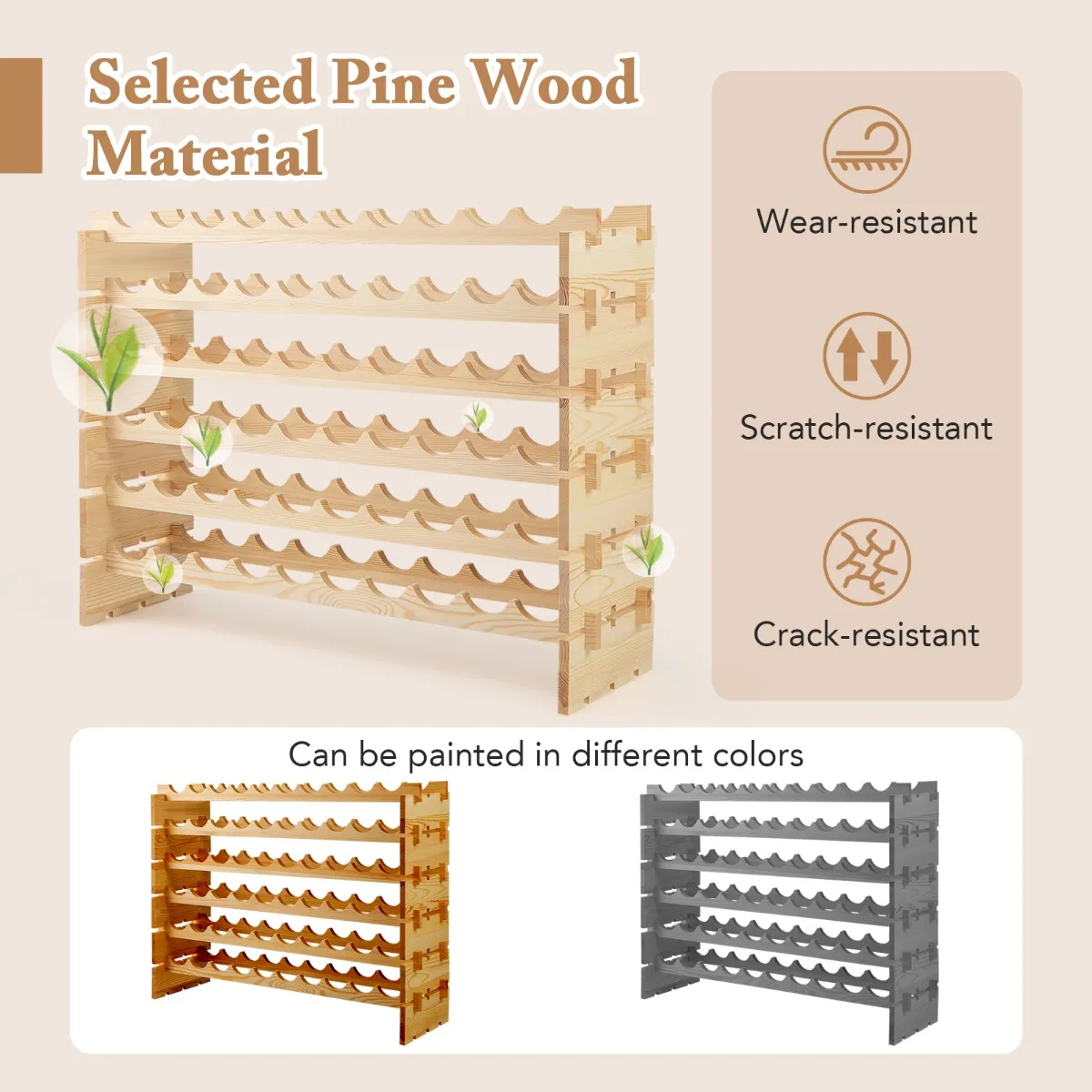 【Dennenhout van hoge kwaliteit】: Dit vrijstaande wijnrek is gemaakt van natuurlijk, robuust dennenhout en is van natuurlijke schoonheid en bestand tegen krassen en barsten. De stabiele constructie zorgt ervoor dat je wijncollectie zowel beschermd als elegant gepresenteerd wordt.