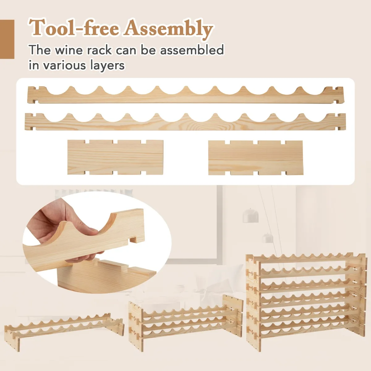 【Eenvoudige, flexibele montage】: Je wijnrek kan zonder gereedschap in elkaar worden gezet, waardoor je tijd en moeite bespaart. Dankzij het zelfdragende ontwerp kun je de niveaus gemakkelijk aanpassen aan je veranderende opslagbehoeften.
