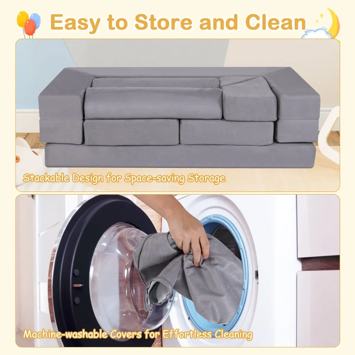 【Super eenvoudig op te bergen en te reinigen】: Als ze niet worden gebruikt, kunnen de schuimblokken op een compact formaat worden gestapeld en in elke hoek van je kamer worden opgeborgen. Bovendien zijn de afneembare hoezen machinewasbaar in koud water en kunnen ze op lage temperatuur in de droger worden gedroogd. De stoffen overtrekken zijn bestand tegen verbleken of krimpen.