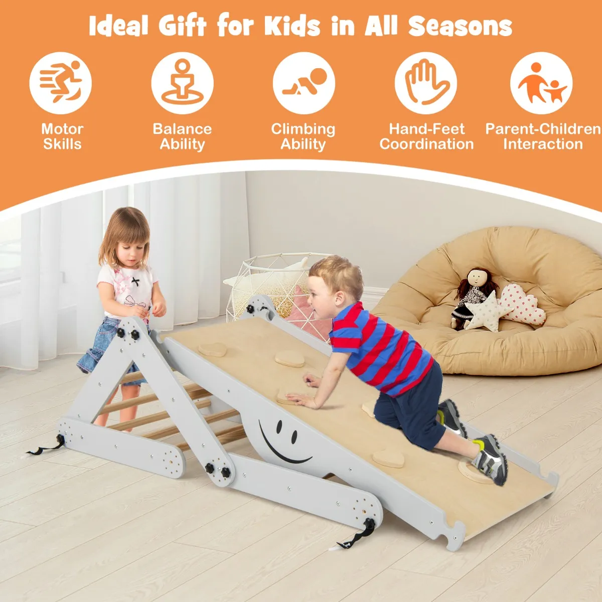 Onze 5-in-1 klimset bevat een omvormbare ladder en een dubbelzijdige helling, zodat kinderen kunnen klimmen, kruipen en glijden. De ladder is eenvoudig in verschillende vormen te veranderen en u kunt de hoogte van de helling aanpassen om te glijden of te klimmen. U kunt de helling ook omdraaien als een wip, zodat uw kind erop kan schommelen. Stevige houten staven en gekleurde stenen helpen hem bij het klimmen. Gemaakt van veilig grenenhout voor betrouwbaar gebruik. Kan worden opgevouwen voor ruimtebesparende opslag en is ideaal voor in de slaapkamer, speelkamer, kleuterschool of kinderdagverblijf van uw kind.