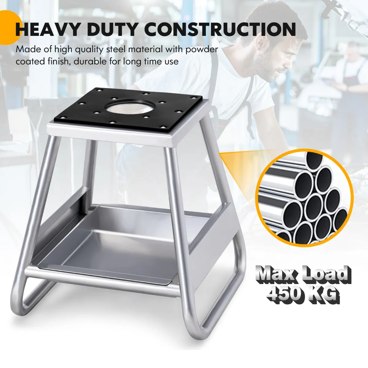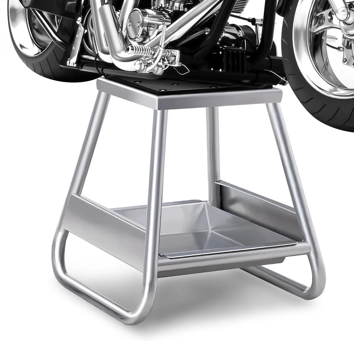 De robuuste metalen constructie met antislip bovenkant en brede basis is gebouwd voor maximale stabiliteit en is geschikt voor de meeste motorfietsen tot 450 kg. Door de poedercoating is de crossmotorstandaard roestbestendig. Nog beter: wij bieden u een afneembare oliecarter aan om de vervangen olie op te vangen. De motorfietsstandaard is draagbaar en compact, wat een geweldig hulpmiddel zal zijn voor het verwisselen van uw banden en andere reparatiewerkzaamheden op het circuit, op het parcours, in de winkel of in de garage.