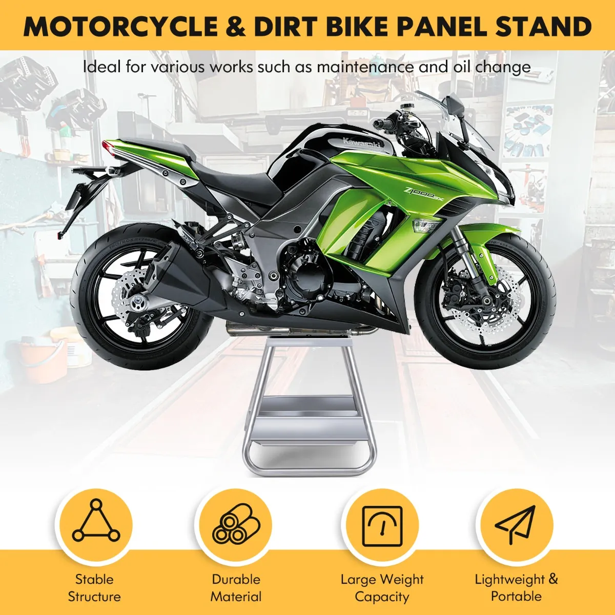 Stevig metalen frame en antislip bovenkant: Door het gebruik van een duurzaam gelast metalen frame is de motorfietsstandaard stevig en stevig. Het oppervlak is behandeld met zilverpoedercoating, dus roest niet gemakkelijk. Het extra dikke en antislip rubberen kussen houdt je motorfiets op zijn plaats.
