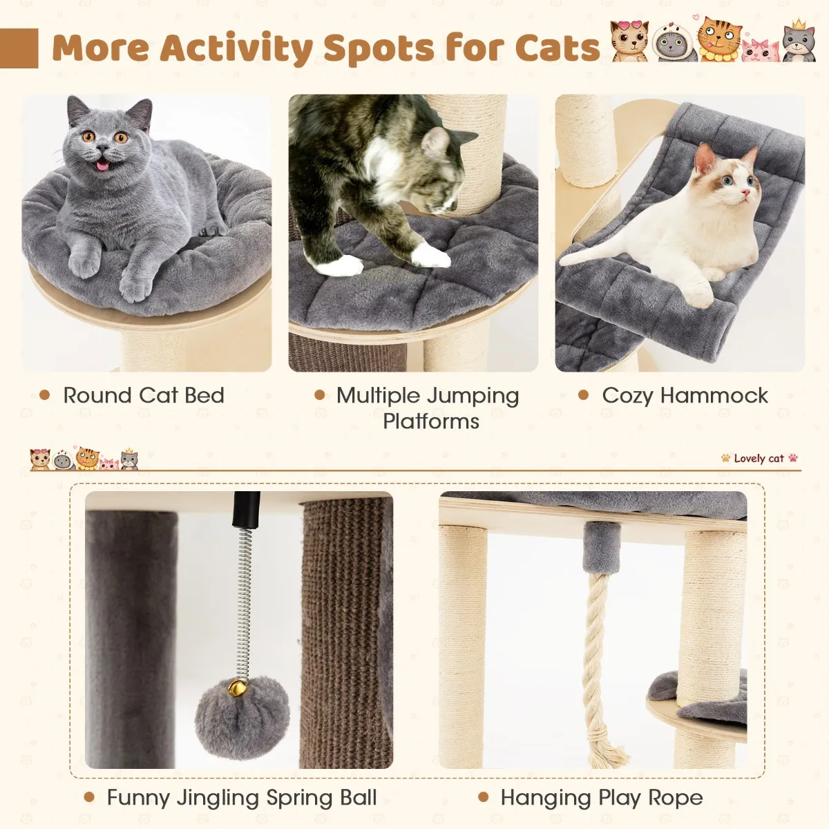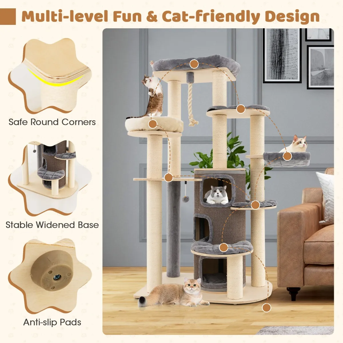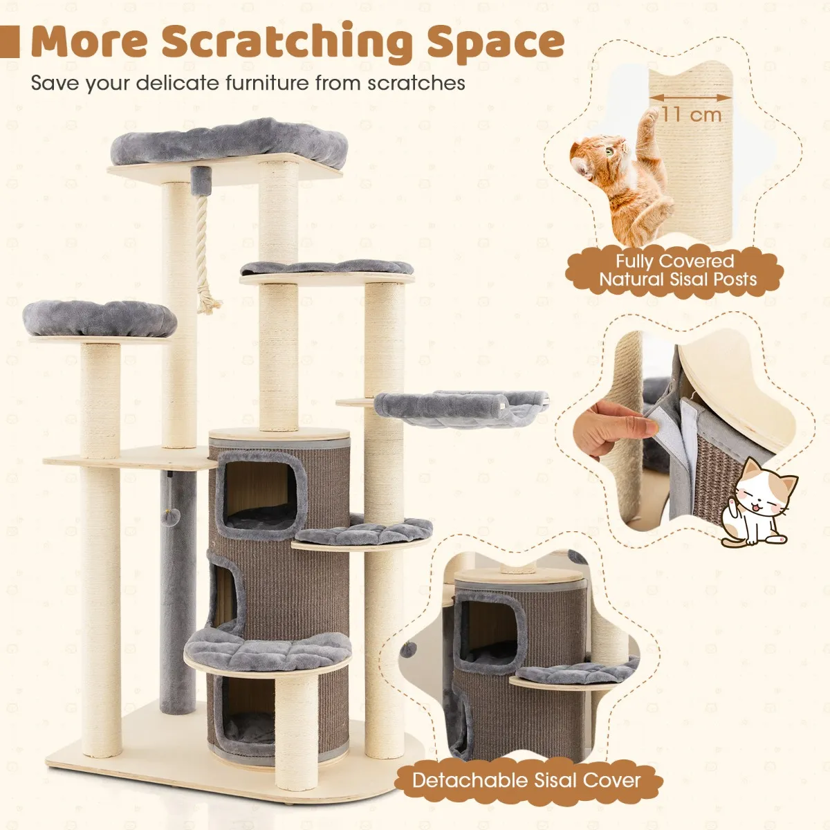 Onze moderne krabpaal is ontworpen met zitstokken, een slaapbed en 3 springplatforms. De condo met 3 verdiepingen is uitgerust met een zacht kussen en een grote ingang, zodat ze zich kunnen koesteren in privacy en comfort. Het dikke sisaltouw, de plank en de springbal zorgen ervoor dat ze zich kunnen uitleven, hun instincten kunnen uitleven en hun klauwen kunnen scherpen. Elke laag heeft een afneembaar, wasbaar kussen. De brede basis heeft antislipkussentjes voor stabiliteit en maakt geen krassen op de vloer.